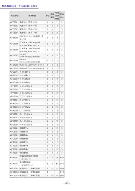 共通教養科目・外国語科目2025科目番号授業科目GFE3001英語Ⅴa(各テーマ)GFE3002英語Ⅴb(各テーマ)GFE3003英語Ⅵa(各テーマ)GFE3004GFE3005GFE3005GFE3006GFE3007GFE3008GFE3009英語Ⅵb(各テーマ)プロフェッショナル英語(各テーマ)PracticalListeningandReading(Advanced)aPracticalListeningandReading(Advanced)bPracticalCommunication(Advanced)aPracticalCommunication(Advanced)bBusinessCommunicationaGFE3010BusinessCommunicationbGFG3001ドイツ語ⅤaGFG3002ドイツ語ⅤbGFG3003ドイツ語ⅥaGFG3004ドイツ語ⅥbGFF3001フランス語ⅤaGFF3002フランス語ⅤbGFF3003フランス語ⅥaGFF3004フランス語ⅥbGFR3001ロシア語ⅤaGFR3002ロシア語ⅤbGFR3003ロシア語ⅥaGFR3004ロシア語ⅥbGFS3001スペイン語ⅤaGFS3002スペイン語ⅤbGFS3003スペイン語ⅥaGFS3004スペイン語ⅥbGFC3001中国語ⅤaGFC3002中国語ⅤbGFC3003中国語ⅥaGFC3004中国語ⅥbGFK3001朝鮮語ⅤaGFK3002朝鮮語ⅤbGFK3003朝鮮語ⅥaGFK3004GFP1001GFP1001GFO1001朝鮮語Ⅵb政策創造学部海外研修(各セミナー)海外特別研修(各プログラム)検定認定1(各検定試験)GFO1002検定認定2(各検定試験)GFO1003検定認定3(各検定試験)単位授業期間毎週授業時間配当年次11111111111111111111111111111111111262221111111111111111111111111111111111111───222222222222222222222222222222222224333333333333333333333333333333333331~4121~4───1~41~41~4-361-