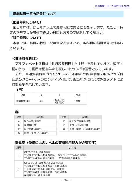 授業科目一覧の記号について〔配当年次について〕共通教養科目・外国語科目2025配当年次は、該当年次以上で履修可能であることを示します。ただし、特定の学年でしか履修できない科目もあるので留意してください。〔科目番号について〕本学では、科目の特性・配当年次を示すため、各科目に科目番号を付与しています。共通教養科目>アルファベット3桁は「共通教養科目」と「群」を表しています。数字4<桁のうち、1桁目は配当年次を表し、後の3桁は連番としています。また、共通教養科目のうちグローバル科目群の留学準備スキルアップ科目及びグローバル・フロンティア科目は、配当年次に代えて外部テストによる難易度を示しています。A群1配当年次(難易度)000連番記号EFG示す群キャリア形成科目群グローバル科目群大学・学部・社会連携科目群易度(受講には各レベルの英語運用能力が必要です)難記号12レベルTOEFLiBTⓇTest40点未満英語検定準2級未満GTECテスト180点未満TOEFLITPⓇTest430点未満TOEICⓇL&RTest375点未満GTECテスト180点以上260点未満TOEFLITPⓇTest430点以上505点未満TOEFLiBTⓇTest40点以上60点未満TOEICⓇL&RTest375点以上580点未満英語検定準2級及び2級-362-示す群ABCD関西大学科目群基盤科目群自己形成科目群健康・スポーツ科目群(例)GE共通教養科目群記号