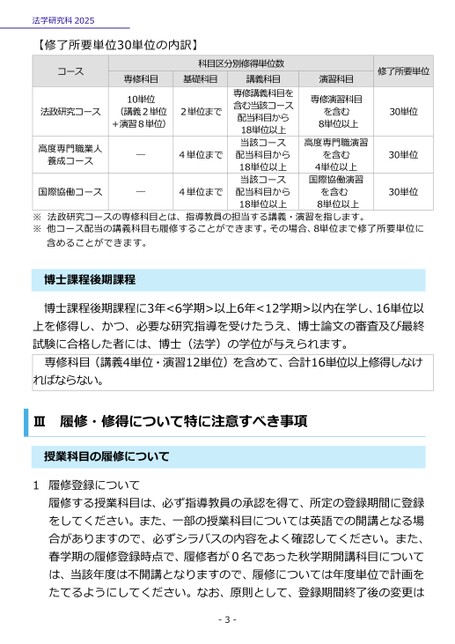 科目区分別修得単位数講義科目基礎科目演習科目修了所要単位専修講義科目を含む当該コース配当科目から18単位以上当該コース配当科目から18単位以上当該コース配当科目から18単位以上専修演習科目を含む8単位以上高度専門職演習を含む4単位以上国際協働演習を含む8単位以上30単位30単位30単位※法政研究コースの専修科目とは、指導教員の担当する講義・演習を指します。※他コース配当の講義科目も履修することができます。その場合、8単位まで修了所要単位に博士課程後期課程に3年<6学期>以上6年<12学期>以内在学し、16単位以上を修得し、かつ、必要な研究指導を受けたうえ、博士論文の審査及び最終試験に合格した者には、博士(法学)の学位が与えられます。専修科目(講義4単位・演習12単位)を含めて、合計16単位以上修得しなければならない。履修・修得について特に注意すべき事項Ⅲ授業科目の履修について1履修登録について履修する授業科目は、必ず指導教員の承認を得て、所定の登録期間に登録をしてください。また、一部の授業科目については英語での開講となる場合がありますので、必ずシラバスの内容をよく確認してください。また、春学期の履修登録時点で、履修者が0名であった秋学期開講科目については、当該年度は不開講となりますので、履修については年度単位で計画をたてるようにしてください。なお、原則として、登録期間終了後の変更は-3-含めることができます。士課程後期課程博法学研究科2025【修了所要単位30単位の内訳】コース法政研究コース高度専門職業人養成コース国際協働コース専修科目10単位(講義2単位+演習8単位)2単位まで――4単位まで4単位まで