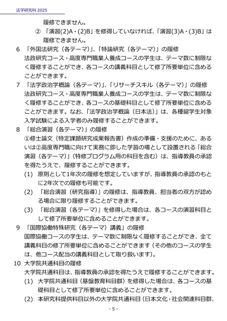法学研究科2025履修できません。②「演習(2)A・(2)B」を修得していなければ、「演習(3)A・(3)B」は履修できません。6「外国法研究(各テーマ)」、「特論研究(各テーマ)」の履修法政研究コース・高度専門職業人養成コースの学生は、テーマ数に制限なく履修することができ、各コースの講義科目として修了所要単位に含めることができます。7「法学政治学概論(各テーマ)」、「リサーチスキル(各テーマ)」の履修法政研究コース・高度専門職業人養成コースの学生は、テーマ数に制限なく履修することができ、各コースの基礎科目として修了所要単位に含めることができます。なお、「法学政治学概論(日本法)」は、各種留学生対象入学試験による入学者のみ履修することができます。8「総合演習(各テーマ)」の履修①修士論文(特定課題研究成果報告書)作成の準備・支援のために、あるいは②高度専門職に向けて実務に即した学習の場として設置される「総合演習(各テーマ)」(特修プログラム用の科目を含む)は、指導教員の承認を得たうえで、履修することができます。(1)原則として1年次の履修を想定していますが、指導教員の承認のもとに2年次での履修も可能です。「総合演習(研究指導)」の履修は、指導教員、担当者の双方が認める場合に限り履修することができます。「総合演習(各テーマ)」を修得した場合は、各コースの演習科目として修了所要単位に含めることができます。(2)(3)9「国際協働特殊研究(各テーマ)講義」の履修国際協働コースの学生は、テーマ数に制限なく履修することができ、全て講義科目の修了所要単位に含めることができます(その他のコースの学生は、他コース配当の講義科目として取り扱います)。10大学院共通科目の履修大学院共通科目は、指導教員の承認を得たうえで履修することができます。(1)大学院共通科目(基盤教育科目群)を修得した場合は、各コースの基礎科目として修了所要単位に含めることができます。本研究科提供科目以外の大学院共通科目(日本文化・社会関連科目群、-5-(2)