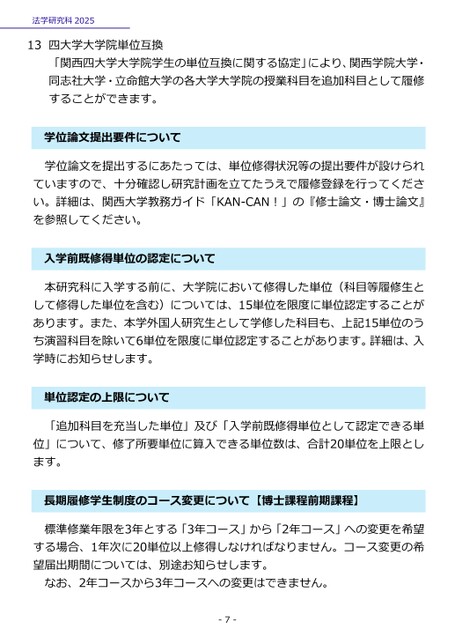 「関西四大学大学院学生の単位互換に関する協定」により、関西学院大学・同志社大学・立命館大学の各大学大学院の授業科目を追加科目として履修することができます。位論文提出要件について学学位論文を提出するにあたっては、単位修得状況等の提出要件が設けられていますので、十分確認し研究計画を立てたうえで履修登録を行ってください。詳細は、関西大学教務ガイド「KAN-CAN!」の『修士論文・博士論文』を参照してください。入学前既修得単位の認定について本研究科に入学する前に、大学院において修得した単位(科目等履修生として修得した単位を含む)については、15単位を限度に単位認定することがあります。また、本学外国人研究生として学修した科目も、上記15単位のうち演習科目を除いて6単位を限度に単位認定することがあります。詳細は、入学時にお知らせします。単位認定の上限について「追加科目を充当した単位」及び「入学前既修得単位として認定できる単位」について、修了所要単位に算入できる単位数は、合計20単位を上限とします。期履修学生制度のコース変更について【博士課程前期課程】長標準修業年限を3年とする「3年コース」から「2年コース」への変更を希望する場合、1年次に20単位以上修得しなければなりません。コース変更の希望届出期間については、別途お知らせします。なお、2年コースから3年コースへの変更はできません。-7-法学研究科202513四大学大学院単位互換