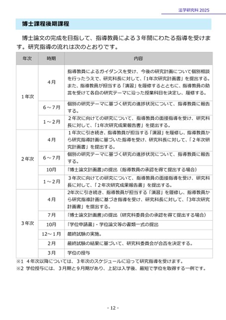 博士課程後期課程法学研究科2025博士論文の完成を目指して、指導教員による3年間にわたる指導を受けます。研究指導の流れは次のとおりです。年次時期内容1年次4月6~7月1~2月4月2年次6~7月10月1~2月4月7月10月3年次指導教員によるガイダンスを受け、今後の研究計画について個別相談を行ったうえで、研究科長に対して、「1年次研究計画書」を提出する。また、指導教員が担当する「演習」を履修するとともに、指導教員の助言を受けて各自の研究テーマに沿った授業科目を決定し、履修する。個別の研究テーマに基づく研究の進捗状況について、指導教員に報告する。2年次に向けての研究について、指導教員の面接指導を受け、研究科長に対して、「1年次研究成果報告書」を提出する。1年次に引き続き、指導教員が担当する「演習」を履修し、指導教員から研究指導計画に基づいた指導を受け、研究科長に対して、「2年次研究計画書」を提出する。個別の研究テーマに基づく研究の進捗状況について、指導教員に報告する。「博士論文計画書」の提出(指導教員の承認を得て提出する場合)3年次に向けての研究について、指導教員の面接指導を受け、研究科長に対して、「2年次研究成果報告書」を提出する。2年次に引き続き、指導教員が担当する「演習」を履修し、指導教員から研究指導計画に基づき指導を受け、研究科長に対して、「3年次研究計画書」を提出する。「博士論文計画書」の提出(研究科委員会の承認を得て提出する場合)「学位申請書」・学位論文等の書類一式の提出12~1月最終試験の実施。2月3月最終試験の結果に基づいて、研究科委員会が合否を決定する。学位の授与※14年次以降については、3年次のスケジュールに沿って研究指導を受けます。※2学位授与には、3月期と9月期があり、上記は入学後、最短で学位を取得する一例です。-12-