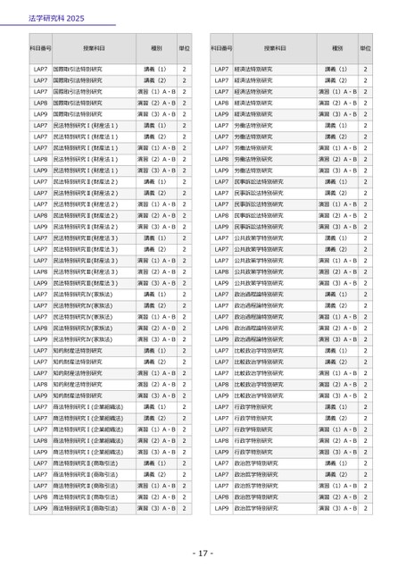 法学研究科2025-17-科目番号授業科目種別単位LAP7国際取引法特別研究講義(1)2LAP7国際取引法特別研究講義(2)2LAP7国際取引法特別研究演習(1)A・B2LAP8国際取引法特別研究演習(2)A・B2LAP9国際取引法特別研究演習(3)A・B2LAP7民法特別研究Ⅰ(財産法1)講義(1)2LAP7民法特別研究Ⅰ(財産法1)講義(2)2LAP7民法特別研究Ⅰ(財産法1)演習(1)A・B2LAP8民法特別研究Ⅰ(財産法1)演習(2)A・B2LAP9民法特別研究Ⅰ(財産法1)演習(3)A・B2LAP7民法特別研究Ⅱ(財産法2)講義(1)2LAP7民法特別研究Ⅱ(財産法2)講義(2)2LAP7民法特別研究Ⅱ(財産法2)演習(1)A・B2LAP8民法特別研究Ⅱ(財産法2)演習(2)A・B2LAP9民法特別研究Ⅱ(財産法2)演習(3)A・B2LAP7民法特別研究Ⅲ(財産法3)講義(1)2LAP7民法特別研究Ⅲ(財産法3)講義(2)2LAP7民法特別研究Ⅲ(財産法3)演習(1)A・B2LAP8民法特別研究Ⅲ(財産法3)演習(2)A・B2LAP9民法特別研究Ⅲ(財産法3)演習(3)A・B2LAP7民法特別研究Ⅳ(家族法)講義(1)2LAP7民法特別研究Ⅳ(家族法)講義(2)2LAP7民法特別研究Ⅳ(家族法)演習(1)A・B2LAP8民法特別研究Ⅳ(家族法)演習(2)A・B2LAP9民法特別研究Ⅳ(家族法)演習(3)A・B2LAP7知的財産法特別研究講義(1)2LAP7知的財産法特別研究講義(2)2LAP7知的財産法特別研究演習(1)A・B2LAP8知的財産法特別研究演習(2)A・B2LAP9知的財産法特別研究演習(3)A・B2LAP7商法特別研究Ⅰ(企業組織法)講義(1)2LAP7商法特別研究Ⅰ(企業組織法)講義(2)2LAP7商法特別研究Ⅰ(企業組織法)演習(1)A・B2LAP8商法特別研究Ⅰ(企業組織法)演習(2)A・B2LAP9商法特別研究Ⅰ(企業組織法)演習(3)A・B2LAP7商法特別研究Ⅱ(商取引法)講義(1)2LAP7商法特別研究Ⅱ(商取引法)講義(2)2LAP7商法特別研究Ⅱ(商取引法)演習(1)A・B2LAP8商法特別研究Ⅱ(商取引法)演習(2)A・B2LAP9商法特別研究Ⅱ(商取引法)演習(3)A・B2科目番号授業科目種別単位LAP7経済法特別研究講義(1)2LAP7経済法特別研究講義(2)2LAP7経済法特別研究演習(1)A・B2LAP8経済法特別研究演習(2)A・B2LAP9経済法特別研究演習(3)A・B2LAP7労働法特別研究講義(1)2LAP7労働法特別研究講義(2)2LAP7労働法特別研究演習(1)A・B2LAP8労働法特別研究演習(2)A・B2LAP9労働法特別研究演習(3)A・B2LAP7民事訴訟法特別研究講義(1)2LAP7民事訴訟法特別研究講義(2)2LAP7民事訴訟法特別研究演習(1)A・B2LAP8民事訴訟法特別研究演習(2)A・B2LAP9民事訴訟法特別研究演習(3)A・B2LAP7公共政策学特別研究講義(1)2LAP7公共政策学特別研究講義(2)2LAP7公共政策学特別研究演習(1)A・B2LAP8公共政策学特別研究演習(2)A・B2LAP9公共政策学特別研究演習(3)A・B2LAP7政治過程論特別研究講義(1)2LAP7政治過程論特別研究講義(2)2LAP7政治過程論特別研究演習(1)A・B2LAP8政治過程論特別研究演習(2)A・B2LAP9政治過程論特別研究演習(3)A・B2LAP7比較政治学特別研究講義(1)2LAP7比較政治学特別研究講義(2)2LAP7比較政治学特別研究演習(1)A・B2LAP8比較政治学特別研究演習(2)A・B2LAP9比較政治学特別研究演習(3)A・B2LAP7行政学特別研究講義(1)2LAP7行政学特別研究講義(2)2LAP7行政学特別研究演習(1)A・B2LAP8行政学特別研究演習(2)A・B2LAP9行政学特別研究演習(3)A・B2LAP7政治哲学特別研究講義(1)2LAP7政治哲学特別研究講義(2)2LAP7政治哲学特別研究演習(1)A・B2LAP8政治哲学特別研究演習(2)A・B2LAP9政治哲学特別研究演習(3)A・B2