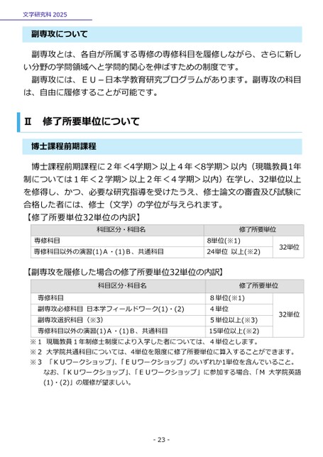 文学研究科2025副専攻について副専攻とは、各自が所属する専修の専修科目を履修しながら、さらに新しい分野の学問領域へと学問的関心を伸ばすための制度です。副専攻には、EU-日本学教育研究プログラムがあります。副専攻の科目は、自由に履修することが可能です。Ⅱ修了所要単位について博士課程前期課程博士課程前期課程に2年<4学期>以上4年<8学期>以内(現職教員1年制については1年<2学期>以上2年<4学期>以内)在学し、32単位以上を修得し、かつ、必要な研究指導を受けたうえ、修士論文の審査及び試験に合格した者には、修士(文学)の学位が与えられます。【修了所要単位32単位の内訳】科目区分・科目名修了所要単位専修科目専修科目以外の演習(1)A・(1)B、共通科目8単位(※1)24単位以上(※2)32単位副専攻を履修した場合の修了所要単位32単位の内訳】科目区分・科目名修了所要単位【専修科目副専攻必修科目日本学フィールドワーク(1)・(2)副専攻選択科目(※3)専修科目以外の演習(1)A・(1)B、共通科目8単位(※1)4単位5単位以上(※3)15単位以上(※2)※1現職教員1年制修士制度により入学した者については、4単位とします。※2大学院共通科目については、4単位を限度に修了所要単位に算入することができます。※3「KUワークショップ」、「EUワークショップ」のいずれか1単位を含んでいること。32単位なお、「KUワークショップ」、「EUワークショップ」に参加する場合、「M大学院英語(1)・(2)」の履修が望ましい。-23-