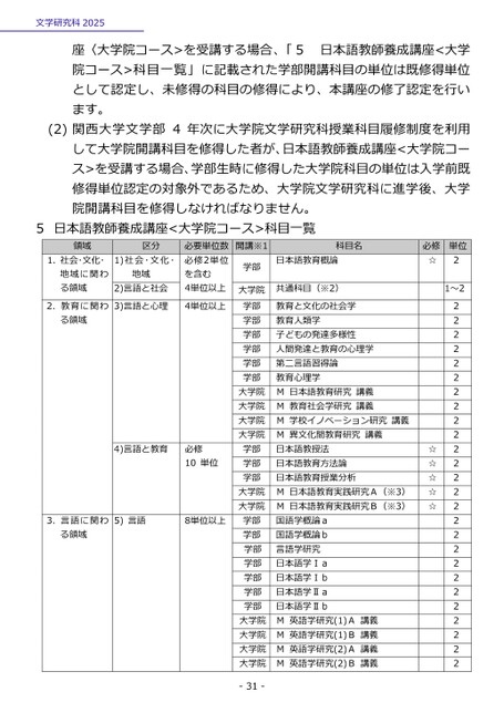 文学研究科2025日本語教師養成講座<大学座〈大学院コース>を受講する場合、「5院コース>科目一覧」に記載された学部開講科目の単位は既修得単位として認定し、未修得の科目の修得により、本講座の修了認定を行います。(2)関西大学文学部4年次に大学院文学研究科授業科目履修制度を利用して大学院開講科目を修得した者が、日本語教師養成講座<大学院コース>を受講する場合、学部生時に修得した大学院科目の単位は入学前既修得単位認定の対象外であるため、大学院文学研究科に進学後、大学院開講科目を修得しなければなりません。5日本語教師養成講座<大学院コース>科目一覧必要単位数開講※1必修2単位を含む4単位以上学部大学院領域区分1.社会・文化・地域に関わる領域1)社会・文化・地域2)言語と社会2.教育に関わ3)言語と心理4単位以上る領域4)言語と教育必修10単位3.言語に関わ5)言語8単位以上る領域学部学部学部学部学部学部大学院大学院大学院大学院学部学部学部大学院大学院学部学部学部学部学部学部学部大学院大学院大学院大学院-31-科目名日本語教育概論共通科目(※2)教育と文化の社会学教育人類学子どもの発達多様性人間発達と教育の心理学第二言語習得論教育心理学M日本語教育研究講義M教育社会学研究講義M学校イノベーション研究講義M異文化間教育研究講義日本語教授法日本語教育方法論日本語教育授業分析M日本語教育実践研究A(※3)M日本語教育実践研究B(※3)国語学概論a国語学概論b言語学研究日本語学Ⅰa日本語学Ⅰb日本語学Ⅱa日本語学ⅡbM英語学研究(1)A講義M英語学研究(1)B講義M英語学研究(2)A講義M英語学研究(2)B講義必修☆単位2☆☆☆☆☆1~222222222222222222222222222