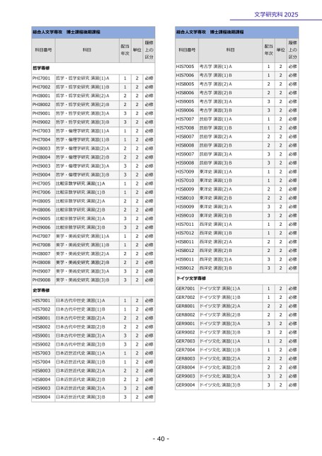 -40-文学研究科2025総合人文学専攻博士課程後期課程科目番号科目年次配当単位上の履修区分哲学専修PHI7001哲学・哲学史研究演習(1)A12必修PHI7002哲学・哲学史研究演習(1)B12必修PHI8001哲学・哲学史研究演習(2)A22必修PHI8002哲学・哲学史研究演習(2)B22必修PHI9001哲学・哲学史研究演習(3)A32必修PHI9002哲学・哲学史研究演習(3)B32必修PHI7003哲学・倫理学研究演習(1)A12必修PHI7004哲学・倫理学研究演習(1)B12必修PHI8003哲学・倫理学研究演習(2)A22必修PHI8004哲学・倫理学研究演習(2)B22必修PHI9003哲学・倫理学研究演習(3)A32必修PHI9004哲学・倫理学研究演習(3)B32必修PHI7005比較宗教学研究演習(1)A12必修PHI7006比較宗教学研究演習(1)B12必修PHI8005比較宗教学研究演習(2)A22必修PHI8006比較宗教学研究演習(2)B22必修PHI9005比較宗教学研究演習(3)A32必修PHI9006比較宗教学研究演習(3)B32必修PHI7007美学・美術史研究演習(1)A12必修PHI7008美学・美術史研究演習(1)B12必修PHI8007美学・美術史研究演習(2)A22必修PHI8008美学・美術史研究演習(2)B22必修PHI9007美学・美術史研究演習(3)A32必修PHI9008美学・美術史研究演習(3)B32必修史学専修HIS7001日本古代中世史演習(1)A12必修HIS7002日本古代中世史演習(1)B12必修HIS8001日本古代中世史演習(2)A22必修HIS8002日本古代中世史演習(2)B22必修HIS9001日本古代中世史演習(3)A32必修HIS9002日本古代中世史演習(3)B32必修HIS7003日本近世近代史演習(1)A12必修HIS7004日本近世近代史演習(1)B12必修HIS8003日本近世近代史演習(2)A22必修HIS8004日本近世近代史演習(2)B22必修HIS9003日本近世近代史演習(3)A32必修HIS9004日本近世近代史演習(3)B32必修総合人文学専攻博士課程後期課程科目番号科目年次配当単位上の履修区分HIS7005考古学演習(1)A12必修HIS7006考古学演習(1)B12必修HIS8005考古学演習(2)A22必修HIS8006考古学演習(2)B22必修HIS9005考古学演習(3)A32必修HIS9006考古学演習(3)B32必修HIS7007民俗学演習(1)A12必修HIS7008民俗学演習(1)B12必修HIS8007民俗学演習(2)A22必修HIS8008民俗学演習(2)B22必修HIS9007民俗学演習(3)A32必修HIS9008民俗学演習(3)B32必修HIS7009東洋史演習(1)A12必修HIS7010東洋史演習(1)B12必修HIS8009東洋史演習(2)A22必修HIS8010東洋史演習(2)B22必修HIS9009東洋史演習(3)A32必修HIS9010東洋史演習(3)B32必修HIS7011西洋史演習(1)A12必修HIS7012西洋史演習(1)B12必修HIS8011西洋史演習(2)A22必修HIS8012西洋史演習(2)B22必修HIS9011西洋史演習(3)A32必修HIS9012西洋史演習(3)B32必修ドイツ文学専修GER7001ドイツ文学演習(1)A12必修GER7002ドイツ文学演習(1)B12必修GER8001ドイツ文学演習(2)A22必修GER8002ドイツ文学演習(2)B22必修GER9001ドイツ文学演習(3)A32必修GER9002ドイツ文学演習(3)B32必修GER7003ドイツ文化演習(1)A12必修GER7004ドイツ文化演習(1)B12必修GER8003ドイツ文化演習(2)A22必修GER8004ドイツ文化演習(2)B22必修GER9003ドイツ文化演習(3)A32必修GER9004ドイツ文化演習(3)B32必修