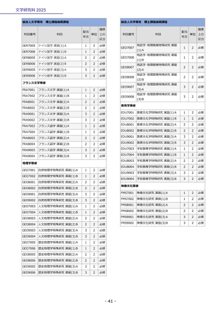 文学研究科2025-41-総合人文学専攻博士課程後期課程科目番号科目年次配当単位上の履修区分GER7005ドイツ語学演習(1)A12必修GER7006ドイツ語学演習(1)B12必修GER8005ドイツ語学演習(2)A22必修GER8006ドイツ語学演習(2)B22必修GER9005ドイツ語学演習(3)A32必修GER9006ドイツ語学演習(3)B32必修フランス文学専修FRA7001フランス文学演習(1)A12必修FRA7002フランス文学演習(1)B12必修FRA8001フランス文学演習(2)A22必修FRA8002フランス文学演習(2)B22必修FRA9001フランス文学演習(3)A32必修FRA9002フランス文学演習(3)B32必修FRA7003フランス語学演習(1)A12必修FRA7004フランス語学演習(1)B12必修FRA8003フランス語学演習(2)A22必修FRA8004フランス語学演習(2)B22必修FRA9003フランス語学演習(3)A32必修FRA9004フランス語学演習(3)B32必修地理学専修GEO7001自然地理学特殊研究演習(1)A12必修GEO7002自然地理学特殊研究演習(1)B12必修GEO8001自然地理学特殊研究演習(2)A22必修GEO8002自然地理学特殊研究演習(2)B22必修GEO9001自然地理学特殊研究演習(3)A32必修GEO9002自然地理学特殊研究演習(3)B32必修GEO7003人文地理学特殊研究演習(1)A12必修GEO7004人文地理学特殊研究演習(1)B12必修GEO8003人文地理学特殊研究演習(2)A22必修GEO8004人文地理学特殊研究演習(2)B22必修GEO9003人文地理学特殊研究演習(3)A32必修GEO9004人文地理学特殊研究演習(3)B32必修GEO7005歴史地理学特殊研究演習(1)A12必修GEO7006歴史地理学特殊研究演習(1)B12必修GEO8005歴史地理学特殊研究演習(2)A22必修GEO8006歴史地理学特殊研究演習(2)B22必修GEO9005歴史地理学特殊研究演習(3)A32必修GEO9006歴史地理学特殊研究演習(3)B32必修総合人文学専攻博士課程後期課程科目番号科目年次配当単位上の履修区分GEO7007地誌学・地理教育特殊研究演習(3)A(2)B地誌学・地理教育特殊研究演習(2)A(1)B地誌学・地理教育特殊研究演習地誌学・地理教育特殊研究演習(1)A地誌学・地理教育特殊研究演習地誌学・地理教育特殊研究演習(3)B12必修GEO700812必修GEO800722必修GEO800822必修GEO900732必修GEO900832必修教育学専修EDU7001教育文化学特殊研究演習(1)A12必修EDU7002教育文化学特殊研究演習(1)B12必修EDU8001教育文化学特殊研究演習(2)A22必修EDU8002教育文化学特殊研究演習(2)B22必修EDU9001教育文化学特殊研究演習(3)A32必修EDU9002教育文化学特殊研究演習(3)B32必修EDU7003学校教育学特殊研究演習(1)A12必修EDU7004学校教育学特殊研究演習(1)B12必修EDU8003学校教育学特殊研究演習(2)A22必修EDU8004学校教育学特殊研究演習(2)B22必修EDU9003学校教育学特殊研究演習(3)A32必修EDU9004学校教育学特殊研究演習(3)B32必修映像文化専修FMS7001映像文化研究演習(1)A12必修FMS7002映像文化研究演習(1)B12必修FMS8001映像文化研究演習(2)A22必修FMS8002映像文化研究演習(2)B22必修FMS9001映像文化研究演習(3)A32必修FMS9002映像文化研究演習(3)B32必修