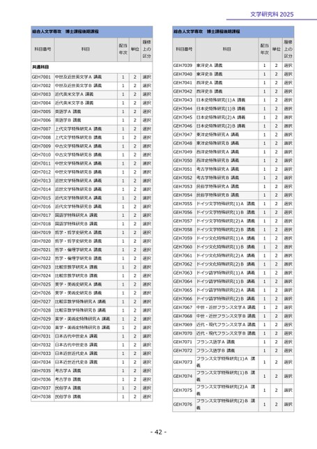 -42-文学研究科2025総合人文学専攻博士課程後期課程科目番号科目年次配当単位上の履修区分共通科目GEH7001中世及近世英文学A講義12選択GEH7002中世及近世英文学B講義12選択GEH7003近代英米文学A講義12選択GEH7004近代英米文学B講義12選択GEH7005英語学A講義12選択GEH7006英語学B講義12選択GEH7007上代文学特殊研究A講義12選択GEH7008上代文学特殊研究B講義12選択GEH7009中古文学特殊研究A講義12選択GEH7010中古文学特殊研究B講義12選択GEH7011中世文学特殊研究A講義12選択GEH7012中世文学特殊研究B講義12選択GEH7013近世文学特殊研究A講義12選択GEH7014近世文学特殊研究B講義12選択GEH7015近代文学特殊研究A講義12選択GEH7016近代文学特殊研究B講義12選択GEH7017国語学特殊研究A講義12選択GEH7018国語学特殊研究B講義12選択GEH7019哲学・哲学史研究A講義12選択GEH7020哲学・哲学史研究B講義12選択GEH7021哲学・倫理学研究A講義12選択GEH7022哲学・倫理学研究B講義12選択GEH7023比較宗教学研究A講義12選択GEH7024比較宗教学研究B講義12選択GEH7025美学・美術史研究A講義12選択GEH7026美学・美術史研究B講義12選択GEH7027比較宗教学特殊研究A講義12選択GEH7028比較宗教学特殊研究B講義12選択GEH7029美学・美術史特殊研究A講義12選択GEH7030美学・美術史特殊研究B講義12選択GEH7031日本古代中世史A講義12選択GEH7032日本古代中世史B講義12選択GEH7033日本近世近代史A講義12選択GEH7034日本近世近代史B講義12選択GEH7035考古学A講義12選択GEH7036考古学B講義12選択GEH7037民俗学A講義12選択GEH7038民俗学B講義12選択総合人文学専攻博士課程後期課程科目番号科目年次配当単位上の履修区分GEH7039東洋史A講義12選択GEH7040東洋史B講義12選択GEH7041西洋史A講義12選択GEH7042西洋史B講義12選択GEH7043日本史特殊研究(1)A講義12選択GEH7044日本史特殊研究(1)B講義12選択GEH7045日本史特殊研究(2)A講義12選択GEH7046日本史特殊研究(2)B講義12選択GEH7047東洋史特殊研究A講義12選択GEH7048東洋史特殊研究B講義12選択GEH7049西洋史特殊研究A講義12選択GEH7050西洋史特殊研究B講義12選択GEH7051考古学特殊研究A講義12選択GEH7052考古学特殊研究B講義12選択GEH7053民俗学特殊研究A講義12選択GEH7054民俗学特殊研究B講義12選択GEH7055ドイツ文学特殊研究(1)A講義12選択GEH7056ドイツ文学特殊研究(1)B講義12選択GEH7057ドイツ文学特殊研究(2)A講義12選択GEH7058ドイツ文学特殊研究(2)B講義12選択GEH7059ドイツ文化特殊研究(1)A講義12選択GEH7060ドイツ文化特殊研究(1)B講義12選択GEH7061ドイツ文化特殊研究(2)A講義12選択GEH7062ドイツ文化特殊研究(2)B講義12選択GEH7063ドイツ語学特殊研究(1)A講義12選択GEH7064ドイツ語学特殊研究(1)B講義12選択GEH7065ドイツ語学特殊研究(2)A講義12選択GEH7066ドイツ語学特殊研究(2)B講義12選択GEH7067中世・近世フランス文学A講義12選択GEH7068中世・近世フランス文学B講義12選択GEH7069近代・現代フランス文学A講義12選択GEH7070近代・現代フランス文学B講義12選択GEH7071フランス語学A講義12選択GEH7072フランス文学特殊研究(2)B講義義フランス文学特殊研究(1)B講フランス文学特殊研究(1)A講フランス語学B講義義フランス文学特殊研究(2)A講義12選択GEH707312選択GEH707412選択GEH707512選択GEH707612選択