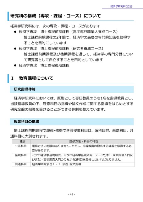 研究科の構成(専攻・課程・コース)について経済学研究科2025経済学研究科には、次の専攻・課程・コースがあります経済学専攻博士課程前期課程(高度専門職業人養成コース)博士課程前期課程の2年間で、経済学の高度の専門的知識を修得することを目的にしています経済学専攻博士課程前期課程(研究者養成コース)博士課程前期課程及び後期課程を通して、経済学の専門分野について研究者として自立することを目的としています経済学専攻博士課程後期課程教育課程についてⅠ研究指導体制経済学研究科においては、原則として専任教員のうち1名を指導教員とし、当該指導教員の下、履修科目の指導や論文作成に関する指導をはじめとする研究全般の指導を受けることができる体制を整えています。業科目の構成授博士課程前期課程で履修・修得できる授業科目は、系科目群、基礎科目、共通科目に大別されます。種別~系科目基礎科目共通科目履修方法・科目の特性履修方法に制限はありません。ただし、指導教員の担当する講義を修得する必要があります。ミクロ経済学基礎研究、マクロ経済学基礎研究、データ分析・政策評価入門及び文献・実地調査入門のうちから2科目を履修しなければなりません。経済学研究演習Ⅰ・Ⅱ演習論文指導-48-
