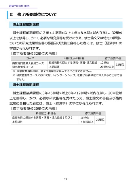 経済学研究科2025Ⅱ修了所要単位について博士課程前期課程博士課程前期課程に2年<4学期>以上4年<8学期>以内在学し、32単位以上を修得し、かつ、必要な研究指導を受けたうえ、修士論文又は特定の課題についての研究成果報告書の審査及び試験に合格した者には、修士(経済学)の学位が与えられます。【修了所要単位32単位の内訳】コース科目区分・科目名修了所要単位高度専門職業人養成コース研究者養成コース※大学院共通科目は、修了所要単位に算入することはできません。※研究者養成コースにおいては、「インターンシップ」を修了所要単位に算入することはでき指導教員の担当する講義・演習・論文指導上記以外12単位20単位以上32単位ません。博士課程後期課程博士課程後期課程に3年<6学期>以上6年<12学期>以内在学し、20単位以上を修得し、かつ、必要な研究指導を受けたうえ、博士論文の審査及び最終試験に合格した者には、博士(経済学)の学位が与えられます。【修了所要単位20単位の内訳】科目区分・科目名指導教員の担当する講義・演習・論文指導Ⅰ及びⅡ上記以外修了所要単位16単位4単位以上20単位-49-