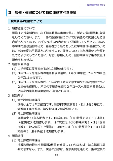 Ⅲ履修・修得について特に注意すべき事項経済学研究科2025授業科目の履修について1履修登録について履修する授業科目は、必ず指導教員の承認を得て、所定の登録期間に登録をしてください。また、一部の授業科目については英語での開講となる場合がありますので、必ずシラバスの内容をよく確認してください。また、春学期の履修登録時点で、履修者が0名であった秋学期開講科目については、当該年度は不開講となりますので、履修については年度単位で計画をたてるようにしてください。なお、原則として、登録期間終了後の変更は認められません。2履修制限単位(1)1学年度に履修できるのは28単位までです。(2)3年コースを選択者の履修制限単位は、1年次20単位、2年次20単位、3年次16単位です。(3)3年コースを選択者が、1年次終了時点で修士論文の提出要件である2単位を修得し、所定の手続きを経て2年コースへ変更する場合は、2年次の履修制限単位は28単位とします。3配当年次(1)博士課程前期課程講義は全て1年次配当です。「経済学研究演習Ⅰ・Ⅱ」は各2単位で、演習は1年次配当、論文指導は2年次配当です。(2)博士課程後期課程講義は全て1年次配当です。1年次には、「○○特殊研究Ⅰ・Ⅱ演習」(各2単位)を履修します。2年次には「○○特殊研究Ⅰ・Ⅱ」「論文指導Ⅰ」(各2単位)を履修し、3年次には「○○特殊研究Ⅰ・Ⅱ」「論文指導Ⅱ(各2単位)」を履修します。4履修条件(1)博士課程前期課程指導教員の担当する演習2科目を修得していなければ、論文指導は履修できません。また、演習の履修は、在学期間を通じて、指導教員の-50-