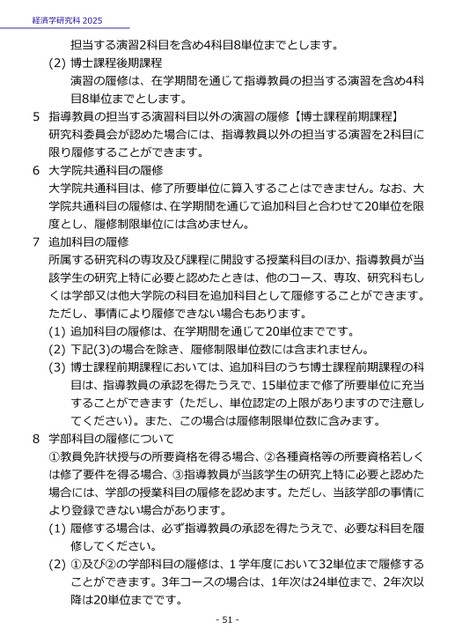 経済学研究科2025担当する演習2科目を含め4科目8単位までとします。(2)博士課程後期課程演習の履修は、在学期間を通じて指導教員の担当する演習を含め4科目8単位までとします。5指導教員の担当する演習科目以外の演習の履修【博士課程前期課程】研究科委員会が認めた場合には、指導教員以外の担当する演習を2科目に限り履修することができます。6大学院共通科目の履修大学院共通科目は、修了所要単位に算入することはできません。なお、大学院共通科目の履修は、在学期間を通じて追加科目と合わせて20単位を限度とし、履修制限単位には含めません。7追加科目の履修所属する研究科の専攻及び課程に開設する授業科目のほか、指導教員が当該学生の研究上特に必要と認めたときは、他のコース、専攻、研究科もしくは学部又は他大学院の科目を追加科目として履修することができます。ただし、事情により履修できない場合もあります。(1)追加科目の履修は、在学期間を通じて20単位までです。(2)下記(3)の場合を除き、履修制限単位数には含まれません。(3)博士課程前期課程においては、追加科目のうち博士課程前期課程の科目は、指導教員の承認を得たうえで、15単位まで修了所要単位に充当することができます(ただし、単位認定の上限がありますので注意してください)。また、この場合は履修制限単位数に含みます。8学部科目の履修について①教員免許状授与の所要資格を得る場合、②各種資格等の所要資格若しくは修了要件を得る場合、③指導教員が当該学生の研究上特に必要と認めた場合には、学部の授業科目の履修を認めます。ただし、当該学部の事情により登録できない場合があります。(1)履修する場合は、必ず指導教員の承認を得たうえで、必要な科目を履修してください。(2)①及び②の学部科目の履修は、1学年度において32単位まで履修することができます。3年コースの場合は、1年次は24単位まで、2年次以降は20単位までです。-51-