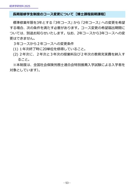 経済学研究科2025長期履修学生制度のコース変更について【博士課程前期課程】標準修業年限を3年とする「3年コース」から「2年コース」への変更を希望する場合、次の条件を満たす必要があります。コース変更の希望届出期間については、別途お知らせいたします。なお、2年コースから3年コースへの変更はできません。3年コースから2年コースへの変更条件(1)1年次終了時に20単位を修得していること。(2)2年次に、2年次と3年次の授業料及び2年次の教育充実費を納入すること。※本制度は、全国社会保険労務士連合会特別推薦入学試験による入学者を対象としています)。-53-