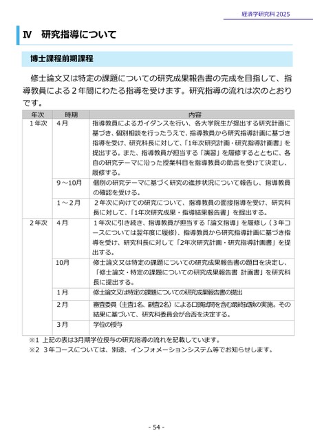 Ⅳ研究指導について博士課程前期課程経済学研究科2025修士論文又は特定の課題についての研究成果報告書の完成を目指して、指導教員による2年間にわたる指導を受けます。研究指導の流れは次のとおりです。年次1年次4月時期内容指導教員によるガイダンスを行い、各大学院生が提出する研究計画に基づき、個別相談を行ったうえで、指導教員から研究指導計画に基づき指導を受け、研究科長に対して、「1年次研究計画・研究指導計画書」を提出する。また、指導教員が担当する「演習」を履修するとともに、各自の研究テーマに沿った授業科目を指導教員の助言を受けて決定し、履修する。個別の研究テーマに基づく研究の進捗状況について報告し、指導教員の確認を受ける。2年次に向けての研究について、指導教員の面接指導を受け、研究科長に対して、「1年次研究成果・指導結果報告書」を提出する。1年次に引き続き、指導教員が担当する「論文指導」を履修し(3年コースについては翌年度に履修)、指導教員から研究指導計画に基づき指導を受け、研究科長に対して「2年次研究計画・研究指導計画書」を提出する。修士論文又は特定の課題についての研究成果報告書の題目を決定し、「修士論文・特定の課題についての研究成果報告書計画書」を研究科長に提出する。修士論文又は特定の課題についての研究成果報告書の提出審査委員(主査1名、副査2名)による口頭試問を含む最終試験の実施。その結果に基づいて、研究科委員会が合否を決定する。学位の授与9~10月1~2月2年次4月10月1月2月3月※1上記の表は3月期学位授与の研究指導の流れを記載しています。※23年コースについては、別途、インフォメーションシステム等でお知らせします。-54-