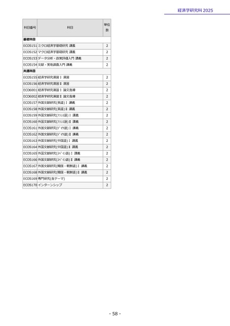 経済学研究科20252222222222222222222222-58-ECO5151ミクロ経済学基礎研究講義ECO5152マクロ経済学基礎研究講義ECO5153データ分析・政策評価入門講義ECO5154文献・実地調査入門講義共通科目ECO5155経済学研究演習Ⅰ演習ECO5156経済学研究演習Ⅱ演習ECO6001経済学研究演習Ⅰ論文指導ECO6002経済学研究演習Ⅱ論文指導ECO5157外国文献研究(英語)Ⅰ講義ECO5158外国文献研究(英語)Ⅱ講義ECO5159外国文献研究(フランス語)Ⅰ講義ECO5160外国文献研究(フランス語)Ⅱ講義ECO5161外国文献研究(ドイツ語)Ⅰ講義ECO5162外国文献研究(ドイツ語)Ⅱ講義ECO5163外国文献研究(中国語)Ⅰ講義ECO5164外国文献研究(中国語)Ⅱ講義ECO5165外国文献研究(スペイン語)Ⅰ講義ECO5166外国文献研究(スペイン語)Ⅱ講義ECO5167外国文献研究(韓国・朝鮮語)Ⅰ講義ECO5168外国文献研究(韓国・朝鮮語)Ⅱ講義ECO5169専門研究(各テーマ)ECO5170インターンシップ科目番号基礎科目科目単位数
