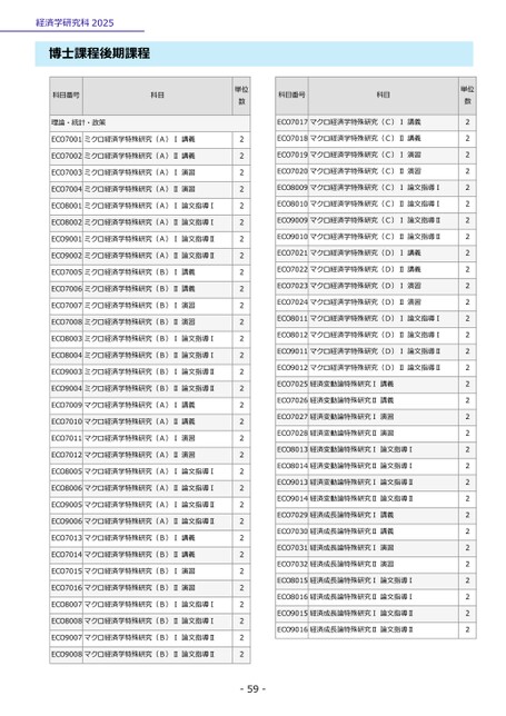 経済学研究科2025博士課程後期課程科目番号科目単位数科目番号科目単位数理論・統計・政策ECO7001ミクロ経済学特殊研究(A)Ⅰ講義ECO7002ミクロ経済学特殊研究(A)Ⅱ講義ECO7003ミクロ経済学特殊研究(A)Ⅰ演習ECO7004ミクロ経済学特殊研究(A)Ⅱ演習ECO8001ミクロ経済学特殊研究(A)Ⅰ論文指導ⅠECO8002ミクロ経済学特殊研究(A)Ⅱ論文指導ⅠECO9001ミクロ経済学特殊研究(A)Ⅰ論文指導ⅡECO9002ミクロ経済学特殊研究(A)Ⅱ論文指導ⅡECO7005ミクロ経済学特殊研究(B)Ⅰ講義ECO7006ミクロ経済学特殊研究(B)Ⅱ講義ECO7007ミクロ経済学特殊研究(B)Ⅰ演習ECO7008ミクロ経済学特殊研究(B)Ⅱ演習ECO8003ミクロ経済学特殊研究(B)Ⅰ論文指導ⅠECO8004ミクロ経済学特殊研究(B)Ⅱ論文指導ⅠECO9003ミクロ経済学特殊研究(B)Ⅰ論文指導ⅡECO9004ミクロ経済学特殊研究(B)Ⅱ論文指導ⅡECO7009マクロ経済学特殊研究(A)Ⅰ講義ECO7010マクロ経済学特殊研究(A)Ⅱ講義ECO7011マクロ経済学特殊研究(A)Ⅰ演習ECO7012マクロ経済学特殊研究(A)Ⅱ演習ECO8005マクロ経済学特殊研究(A)Ⅰ論文指導ⅠECO8006マクロ経済学特殊研究(A)Ⅱ論文指導ⅠECO9005マクロ経済学特殊研究(A)Ⅰ論文指導ⅡECO9006マクロ経済学特殊研究(A)Ⅱ論文指導ⅡECO7013マクロ経済学特殊研究(B)Ⅰ講義ECO7014マクロ経済学特殊研究(B)Ⅱ講義ECO7015マクロ経済学特殊研究(B)Ⅰ演習ECO7016マクロ経済学特殊研究(B)Ⅱ演習ECO8007マクロ経済学特殊研究(B)Ⅰ論文指導ⅠECO8008マクロ経済学特殊研究(B)Ⅱ論文指導ⅠECO9007マクロ経済学特殊研究(B)Ⅰ論文指導ⅡECO9008マクロ経済学特殊研究(B)Ⅱ論文指導Ⅱ22222222222222222222222222222222ECO7017マクロ経済学特殊研究(C)Ⅰ講義ECO7018マクロ経済学特殊研究(C)Ⅱ講義ECO7019マクロ経済学特殊研究(C)Ⅰ演習ECO7020マクロ経済学特殊研究(C)Ⅱ演習ECO8009マクロ経済学特殊研究(C)Ⅰ論文指導ⅠECO8010マクロ経済学特殊研究(C)Ⅱ論文指導ⅠECO9009マクロ経済学特殊研究(C)Ⅰ論文指導ⅡECO9010マクロ経済学特殊研究(C)Ⅱ論文指導ⅡECO7021マクロ経済学特殊研究(D)Ⅰ講義ECO7022マクロ経済学特殊研究(D)Ⅱ講義ECO7023マクロ経済学特殊研究(D)Ⅰ演習ECO7024マクロ経済学特殊研究(D)Ⅱ演習ECO8011マクロ経済学特殊研究(D)Ⅰ論文指導ⅠECO8012マクロ経済学特殊研究(D)Ⅱ論文指導ⅠECO9011マクロ経済学特殊研究(D)Ⅰ論文指導ⅡECO9012マクロ経済学特殊研究(D)Ⅱ論文指導ⅡECO7025経済変動論特殊研究Ⅰ講義ECO7026経済変動論特殊研究Ⅱ講義ECO7027経済変動論特殊研究Ⅰ演習ECO7028経済変動論特殊研究Ⅱ演習ECO8013経済変動論特殊研究Ⅰ論文指導ⅠECO8014経済変動論特殊研究Ⅱ論文指導ⅠECO9013経済変動論特殊研究Ⅰ論文指導ⅡECO9014経済変動論特殊研究Ⅱ論文指導ⅡECO7029経済成長論特殊研究Ⅰ講義ECO7030経済成長論特殊研究Ⅱ講義ECO7031経済成長論特殊研究Ⅰ演習ECO7032経済成長論特殊研究Ⅱ演習ECO8015経済成長論特殊研究Ⅰ論文指導ⅠECO8016経済成長論特殊研究Ⅱ論文指導ⅠECO9015経済成長論特殊研究Ⅰ論文指導ⅡECO9016経済成長論特殊研究Ⅱ論文指導Ⅱ22222222222222222222222222222222-59-