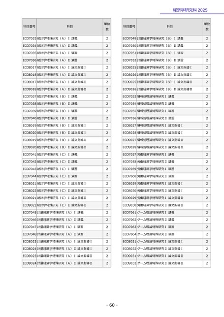 科目番号科目ECO7033統計学特殊研究(A)Ⅰ講義ECO7034統計学特殊研究(A)Ⅱ講義ECO7035統計学特殊研究(A)Ⅰ演習ECO7036統計学特殊研究(A)Ⅱ演習ECO8017統計学特殊研究(A)Ⅰ論文指導ⅠECO8018統計学特殊研究(A)Ⅱ論文指導ⅠECO9017統計学特殊研究(A)Ⅰ論文指導ⅡECO9018統計学特殊研究(A)Ⅱ論文指導ⅡECO7037統計学特殊研究(B)Ⅰ講義ECO7038統計学特殊研究(B)Ⅱ講義ECO7039統計学特殊研究(B)Ⅰ演習ECO7040統計学特殊研究(B)Ⅱ演習ECO8019統計学特殊研究(B)Ⅰ論文指導ⅠECO8020統計学特殊研究(B)Ⅱ論文指導ⅠECO9019統計学特殊研究(B)Ⅰ論文指導ⅡECO9020統計学特殊研究(B)Ⅱ論文指導ⅡECO7041統計学特殊研究(C)Ⅰ講義ECO7042統計学特殊研究(C)Ⅱ講義ECO7043統計学特殊研究(C)Ⅰ演習ECO7044統計学特殊研究(C)Ⅱ演習ECO8021統計学特殊研究(C)Ⅰ論文指導ⅠECO8022統計学特殊研究(C)Ⅱ論文指導ⅠECO9021統計学特殊研究(C)Ⅰ論文指導ⅡECO9022統計学特殊研究(C)Ⅱ論文指導ⅡECO7045計量経済学特殊研究(A)Ⅰ講義ECO7046計量経済学特殊研究(A)Ⅱ講義ECO7047計量経済学特殊研究(A)Ⅰ演習ECO7048計量経済学特殊研究(A)Ⅱ演習ECO8023計量経済学特殊研究(A)Ⅰ論文指導ⅠECO8024計量経済学特殊研究(A)Ⅱ論文指導ⅠECO9023計量経済学特殊研究(A)Ⅰ論文指導ⅡECO9024計量経済学特殊研究(A)Ⅱ論文指導Ⅱ経済学研究科2025単位数科目番号科目単位数ECO7049計量経済学特殊研究(B)Ⅰ講義ECO7050計量経済学特殊研究(B)Ⅱ講義ECO7051計量経済学特殊研究(B)Ⅰ演習ECO7052計量経済学特殊研究(B)Ⅱ演習ECO8025計量経済学特殊研究(B)Ⅰ論文指導ⅠECO8026計量経済学特殊研究(B)Ⅱ論文指導ⅠECO9025計量経済学特殊研究(B)Ⅰ論文指導ⅡECO9026計量経済学特殊研究(B)Ⅱ論文指導ⅡECO7053情報処理論特殊研究Ⅰ講義ECO7054情報処理論特殊研究Ⅱ講義ECO7055情報処理論特殊研究Ⅰ演習ECO7056情報処理論特殊研究Ⅱ演習ECO8027情報処理論特殊研究Ⅰ論文指導ⅠECO8028情報処理論特殊研究Ⅱ論文指導ⅠECO9027情報処理論特殊研究Ⅰ論文指導ⅡECO9028情報処理論特殊研究Ⅱ論文指導ⅡECO7057労働経済学特殊研究Ⅰ講義ECO7058労働経済学特殊研究Ⅱ講義ECO7059労働経済学特殊研究Ⅰ演習ECO7060労働経済学特殊研究Ⅱ演習ECO8029労働経済学特殊研究Ⅰ論文指導ⅠECO8030労働経済学特殊研究Ⅱ論文指導ⅠECO9029労働経済学特殊研究Ⅰ論文指導ⅡECO9030労働経済学特殊研究Ⅱ論文指導ⅡECO7061ゲーム理論特殊研究Ⅰ講義ECO7062ゲーム理論特殊研究Ⅱ講義ECO7063ゲーム理論特殊研究Ⅰ演習ECO7064ゲーム理論特殊研究Ⅱ演習ECO8031ゲーム理論特殊研究Ⅰ論文指導ⅠECO8032ゲーム理論特殊研究Ⅱ論文指導ⅠECO9031ゲーム理論特殊研究Ⅰ論文指導ⅡECO9032ゲーム理論特殊研究Ⅱ論文指導Ⅱ2222222222222222222222222222222222222222222222222222222222222222-60-