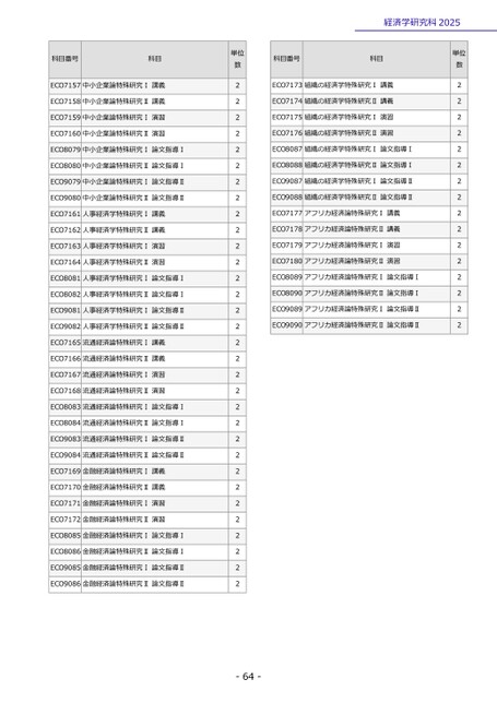 科目番号科目ECO7157中小企業論特殊研究Ⅰ講義ECO7158中小企業論特殊研究Ⅱ講義ECO7159中小企業論特殊研究Ⅰ演習ECO7160中小企業論特殊研究Ⅱ演習ECO8079中小企業論特殊研究Ⅰ論文指導ⅠECO8080中小企業論特殊研究Ⅱ論文指導ⅠECO9079中小企業論特殊研究Ⅰ論文指導ⅡECO9080中小企業論特殊研究Ⅱ論文指導ⅡECO7161人事経済学特殊研究Ⅰ講義ECO7162人事経済学特殊研究Ⅱ講義ECO7163人事経済学特殊研究Ⅰ演習ECO7164人事経済学特殊研究Ⅱ演習ECO8081人事経済学特殊研究Ⅰ論文指導ⅠECO8082人事経済学特殊研究Ⅱ論文指導ⅠECO9081人事経済学特殊研究Ⅰ論文指導ⅡECO9082人事経済学特殊研究Ⅱ論文指導ⅡECO7165流通経済論特殊研究Ⅰ講義ECO7166流通経済論特殊研究Ⅱ講義ECO7167流通経済論特殊研究Ⅰ演習ECO7168流通経済論特殊研究Ⅱ演習ECO8083流通経済論特殊研究Ⅰ論文指導ⅠECO8084流通経済論特殊研究Ⅱ論文指導ⅠECO9083流通経済論特殊研究Ⅰ論文指導ⅡECO9084流通経済論特殊研究Ⅱ論文指導ⅡECO7169金融経済論特殊研究Ⅰ講義ECO7170金融経済論特殊研究Ⅱ講義ECO7171金融経済論特殊研究Ⅰ演習ECO7172金融経済論特殊研究Ⅱ演習ECO8085金融経済論特殊研究Ⅰ論文指導ⅠECO8086金融経済論特殊研究Ⅱ論文指導ⅠECO9085金融経済論特殊研究Ⅰ論文指導ⅡECO9086金融経済論特殊研究Ⅱ論文指導Ⅱ経済学研究科2025単位数科目番号科目単位数ECO7173組織の経済学特殊研究Ⅰ講義ECO7174組織の経済学特殊研究Ⅱ講義ECO7175組織の経済学特殊研究Ⅰ演習ECO7176組織の経済学特殊研究Ⅱ演習ECO8087組織の経済学特殊研究Ⅰ論文指導ⅠECO8088組織の経済学特殊研究Ⅱ論文指導ⅠECO9087組織の経済学特殊研究Ⅰ論文指導ⅡECO9088組織の経済学特殊研究Ⅱ論文指導ⅡECO7177アフリカ経済論特殊研究Ⅰ講義ECO7178アフリカ経済論特殊研究Ⅱ講義ECO7179アフリカ経済論特殊研究Ⅰ演習ECO7180アフリカ経済論特殊研究Ⅱ演習ECO8089アフリカ経済論特殊研究Ⅰ論文指導ⅠECO8090アフリカ経済論特殊研究Ⅱ論文指導ⅠECO9089アフリカ経済論特殊研究Ⅰ論文指導ⅡECO9090アフリカ経済論特殊研究Ⅱ論文指導Ⅱ222222222222222222222222222222222222222222222222-64-