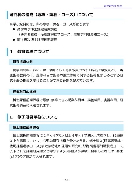 研究科の構成(専攻・課程・コース)について商学研究科2025商学研究科には、次の専攻・課程・コースがあります商学専攻博士課程前期課程(研究者養成・後期課程進学コース、高度専門職養成コース)商学専攻博士課程後期課程教育課程についてⅠ研究指導体制商学研究科においては、原則として専任教員のうち1名を指導教員とし、当該指導教員の下、履修科目の指導や論文作成に関する指導をはじめとする研究全般の指導を受けることができる体制を整えています。業科目の構成授博士課程前期課程で履修・修得できる授業科目は、講義科目、演習科目、研修了所要単位についてⅡ究指導科目に大別されます。博士課程前期課程博士課程前期課程に2年<4学期>以上4年<8学期>以内在学し、32単位以上を修得し、かつ、必要な研究指導を受けたうえ、修士論文(研究者養成・後期課程進学コース)または特定の課題の研究の成果(高度専門職養成コース。以下これを課題研究論文と呼びます)の審査及び試験に合格した者には、修士(商学)の学位が与えられます。-70-