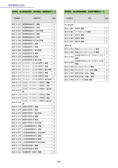 商学研究科2025商学専攻博士課程前期課程研究者養成・後期課程進学コース商学専攻博士課程前期課程高度専門職養成コース科目番号授業科目単位科目番号科目単位22222222222222ベーシックBCS-5-B01経営学講義BCS-5-B02マーケティング講義BCS-5-B03会計学講義BCS-5-B04経済学講義BCS-5-B05統計学講義メソッドBCS-5-M01英語コミュニケーションⅠ講義BCS-5-M02BCS-5-M03BCS-5-M04BCS-5-M05英語コミュニケーションⅡ講義日本語アカデミック・ライティングⅠ講義日本語アカデミック・ライティングⅡ講義ロジカルシンキング講義BCS-5-M06プレゼンテーション技法講義BCS-5-M07研究方法論(定性)講義BCS-5-M08研究方法論(定量)講義BCS-5-M09モデリングの基礎講義-83-BCR-5-167経営戦略論研究Ⅰ講義BCR-5-267経営戦略論研究Ⅰ演習BCR-6-367経営戦略論研究Ⅰ論文指導BCR-5-168経営戦略論研究Ⅱ講義BCR-5-268経営戦略論研究Ⅱ演習BCR-6-368経営戦略論研究Ⅱ論文指導BCR-5-169技術経営研究Ⅰ講義BCR-5-269技術経営研究Ⅰ演習BCR-6-369技術経営研究Ⅰ論文指導BCR-5-170技術経営研究Ⅱ講義BCR-5-270技術経営研究Ⅱ演習BCR-6-370技術経営研究Ⅱ論文指導BCR-5-171ファミリー・ビジネス研究Ⅰ講義BCR-5-271ファミリー・ビジネス研究Ⅰ演習BCR-6-371ファミリー・ビジネス研究Ⅰ論文指導BCR-5-172ファミリー・ビジネス研究Ⅱ講義BCR-5-272ファミリー・ビジネス研究Ⅱ演習BCR-6-372ファミリー・ビジネス研究Ⅱ論文指導BCR-5-173ミクロ・マーケティング研究Ⅰ講義BCR-5-273BCR-6-373BCR-5-174BCR-5-274BCR-6-374BCR-5-175ミクロ・マーケティング研究Ⅰ演習ミクロ・マーケティング研究Ⅰ論文指導ミクロ・マーケティング研究Ⅱ講義ミクロ・マーケティング研究Ⅱ演習ミクロ・マーケティング研究Ⅱ論文指導経営科学研究Ⅰ講義BCR-5-275経営科学研究Ⅰ演習BCR-6-375経営科学研究Ⅰ論文指導BCR-5-176経営科学研究Ⅱ講義BCR-5-276経営科学研究Ⅱ演習BCR-6-376経営科学研究Ⅱ論文指導BCR-5-177人的資源管理研究Ⅰ講義BCR-5-277人的資源管理研究Ⅰ演習BCR-6-377人的資源管理研究Ⅰ論文指導BCR-5-178人的資源管理研究Ⅱ講義BCR-5-278人的資源管理研究Ⅱ演習BCR-6-378人的資源管理研究Ⅱ論文指導BCR-5-179商学研究特論Ⅰ講義BCR-5-180商学研究特論Ⅱ講義BCR-5-181外国書研究(英語)講義222222222222222222222222222222222222222