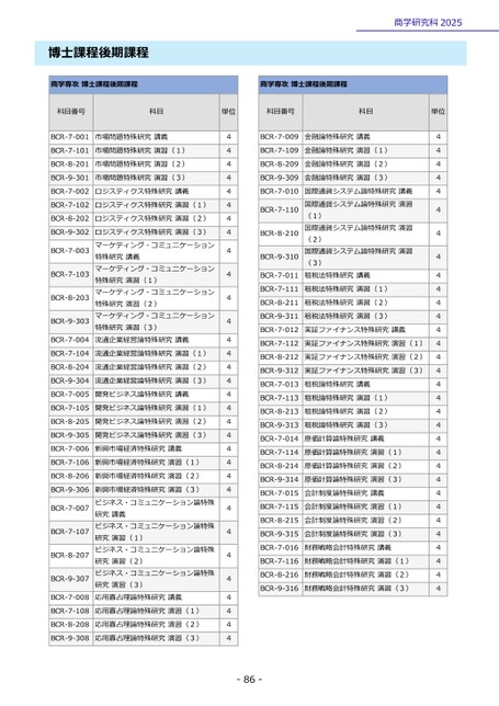 博士課程後期課程商学専攻博士課程後期課程商学専攻博士課程後期課程科目番号科目単位科目番号科目単位商学研究科2025BCR-7-009金融論特殊研究講義BCR-7-109金融論特殊研究演習(1)BCR-8-209金融論特殊研究演習(2)BCR-9-309金融論特殊研究演習(3)BCR-7-010BCR-7-110BCR-8-210BCR-9-310BCR-7-011国際通貨システム論特殊研究講義国際通貨システム論特殊研究演習(1)国際通貨システム論特殊研究演習(2)国際通貨システム論特殊研究演習(3)租税法特殊研究講義BCR-7-111租税法特殊研究演習(1)BCR-8-211租税法特殊研究演習(2)BCR-9-311租税法特殊研究演習(3)BCR-7-012実証ファイナンス特殊研究講義BCR-7-112実証ファイナンス特殊研究演習(1)BCR-8-212実証ファイナンス特殊研究演習(2)BCR-9-312実証ファイナンス特殊研究演習(3)BCR-7-013租税論特殊研究講義BCR-7-113租税論特殊研究演習(1)BCR-8-213租税論特殊研究演習(2)BCR-9-313租税論特殊研究演習(3)BCR-7-014原価計算論特殊研究講義BCR-7-114原価計算論特殊研究演習(1)BCR-8-214原価計算論特殊研究演習(2)BCR-9-314原価計算論特殊研究演習(3)BCR-7-015会計制度論特殊研究講義BCR-7-115会計制度論特殊研究演習(1)BCR-8-215会計制度論特殊研究演習(2)BCR-9-315会計制度論特殊研究演習(3)BCR-7-016財務戦略会計特殊研究講義BCR-7-116財務戦略会計特殊研究演習(1)BCR-8-216財務戦略会計特殊研究演習(2)BCR-9-316財務戦略会計特殊研究演習(3)44444444444444444444444444444444-86-BCR-7-001市場問題特殊研究講義BCR-7-101市場問題特殊研究演習(1)BCR-8-201市場問題特殊研究演習(2)BCR-9-301市場問題特殊研究演習(3)BCR-7-002ロジスティクス特殊研究講義BCR-7-102ロジスティクス特殊研究演習(1)BCR-8-202ロジスティクス特殊研究演習(2)BCR-9-302BCR-7-003BCR-7-103BCR-8-203BCR-9-303BCR-7-004ロジスティクス特殊研究演習(3)マーケティング・コミュニケーション特殊研究講義マーケティング・コミュニケーション特殊研究演習(1)マーケティング・コミュニケーション特殊研究演習(2)マーケティング・コミュニケーション特殊研究演習(3)流通企業経営論特殊研究講義BCR-7-104流通企業経営論特殊研究演習(1)BCR-8-204流通企業経営論特殊研究演習(2)BCR-9-304流通企業経営論特殊研究演習(3)BCR-7-005開発ビジネス論特殊研究講義BCR-7-105開発ビジネス論特殊研究演習(1)BCR-8-205開発ビジネス論特殊研究演習(2)BCR-9-305開発ビジネス論特殊研究演習(3)BCR-7-006新興市場経済特殊研究講義BCR-7-106新興市場経済特殊研究演習(1)BCR-8-206新興市場経済特殊研究演習(2)BCR-9-306BCR-7-007BCR-7-107BCR-8-207BCR-9-307BCR-7-008新興市場経済特殊研究演習(3)ビジネス・コミュニケーション論特殊研究講義ビジネス・コミュニケーション論特殊研究演習(1)ビジネス・コミュニケーション論特殊研究演習(2)ビジネス・コミュニケーション論特殊研究演習(3)応用寡占理論特殊研究講義BCR-7-108応用寡占理論特殊研究演習(1)BCR-8-208応用寡占理論特殊研究演習(2)BCR-9-308応用寡占理論特殊研究演習(3)44444444444444444444444444444444