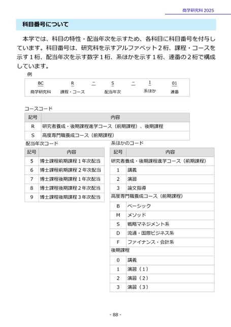 科目番号について商学研究科2025本学では、科目の特性・配当年次を示すため、各科目に科目番号を付与しています。科目番号は、研究科を示すアルファベット2桁、課程・コースを示す1桁、配当年次を示す数字1桁、系ほかを示す1桁、連番の2桁で構成しています。例配当年次コード記号内容56789博士課程前期課程1年次配当博士課程前期課程2年次配当博士課程後期課程1年次配当博士課程後期課程2年次配当博士課程後期課程3年次配当系ほかのコード記号内容研究者養成・後期課程進学コース(前期課程)123講義演習論文指導高度専門職養成コース(前期課程)BMSDFベーシックメソッド戦略マネジメント系流通・国際ビジネス系ファイナンス・会計系後期課程0123講義演習(1)演習(2)演習(3)-88-BCR商学研究科課程・コース-5配当年次-1系ほか01連番RS研究者養成・後期課程進学コース(前期課程)、後期課程高度専門職養成コース(前期課程)内容ースコード記号コ