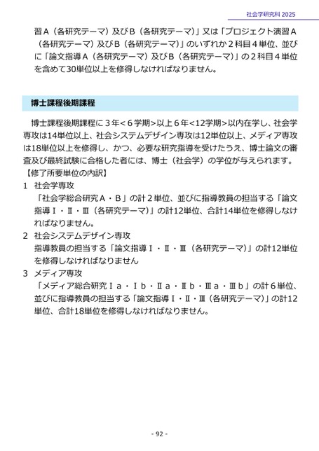 社会学研究科2025習A(各研究テーマ)及びB(各研究テーマ)」又は「プロジェクト演習A(各研究テーマ)及びB(各研究テーマ)」のいずれか2科目4単位、並びに「論文指導A(各研究テーマ)及びB(各研究テーマ)」の2科目4単位を含めて30単位以上を修得しなければなりません。博士課程後期課程博士課程後期課程に3年<6学期>以上6年<12学期>以内在学し、社会学専攻は14単位以上、社会システムデザイン専攻は12単位以上、メディア専攻は18単位以上を修得し、かつ、必要な研究指導を受けたうえ、博士論文の審査及び最終試験に合格した者には、博士(社会学)の学位が与えられます。【修了所要単位の内訳】1社会学専攻「社会学総合研究A・B」の計2単位、並びに指導教員の担当する「論文指導Ⅰ・Ⅱ・Ⅲ(各研究テーマ)」の計12単位、合計14単位を修得しなければなりません。2社会システムデザイン専攻指導教員の担当する「論文指導Ⅰ・Ⅱ・Ⅲ(各研究テーマ)」の計12単位を修得しなければなりません3メディア専攻「メディア総合研究Ⅰa・Ⅰb・Ⅱa・Ⅱb・Ⅲa・Ⅲb」の計6単位、並びに指導教員の担当する「論文指導Ⅰ・Ⅱ・Ⅲ(各研究テーマ)」の計12単位、合計18単位を修得しなければなりません。-92-