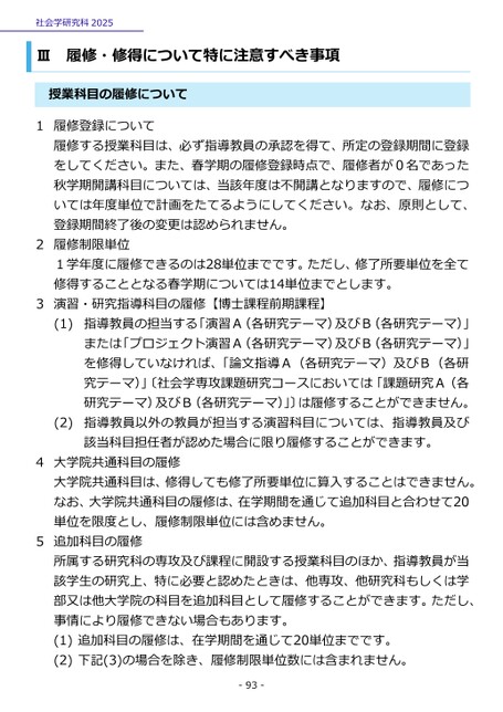 社会学研究科2025Ⅲ履修・修得について特に注意すべき事項授業科目の履修について1履修登録について履修する授業科目は、必ず指導教員の承認を得て、所定の登録期間に登録をしてください。また、春学期の履修登録時点で、履修者が0名であった秋学期開講科目については、当該年度は不開講となりますので、履修については年度単位で計画をたてるようにしてください。なお、原則として、登録期間終了後の変更は認められません。2履修制限単位1学年度に履修できるのは28単位までです。ただし、修了所要単位を全て修得することとなる春学期については14単位までとします。3演習・研究指導科目の履修【博士課程前期課程】(1)(2)指導教員の担当する「演習A(各研究テーマ)及びB(各研究テーマ)」または「プロジェクト演習A(各研究テーマ)及びB(各研究テーマ)」を修得していなければ、「論文指導A(各研究テーマ)及びB(各研究テーマ)」〔社会学専攻課題研究コースにおいては「課題研究A(各研究テーマ)及びB(各研究テーマ)」〕は履修することができません。指導教員以外の教員が担当する演習科目については、指導教員及び該当科目担任者が認めた場合に限り履修することができます。4大学院共通科目の履修大学院共通科目は、修得しても修了所要単位に算入することはできません。なお、大学院共通科目の履修は、在学期間を通じて追加科目と合わせて20単位を限度とし、履修制限単位には含めません。5追加科目の履修所属する研究科の専攻及び課程に開設する授業科目のほか、指導教員が当該学生の研究上、特に必要と認めたときは、他専攻、他研究科もしくは学部又は他大学院の科目を追加科目として履修することができます。ただし、事情により履修できない場合もあります。(1)追加科目の履修は、在学期間を通じて20単位までです。(2)下記(3)の場合を除き、履修制限単位数には含まれません。-93-