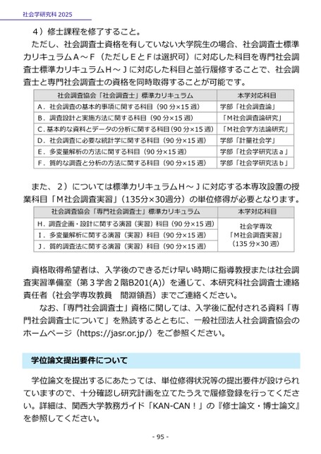 4)修士課程を修了すること。ただし、社会調査士資格を有していない大学院生の場合、社会調査士標準カリキュラムA~F(ただしEとFは選択可)に対応した科目を専門社会調査士標準カリキュラムH~Jに対応した科目と並行履修することで、社会調査士と専門社会調査士の資格を同時取得することが可能です。社会調査協会「社会調査士」標準カリキュラムA.社会調査の基本的事項に関する科目(90分×15週)B.調査設計と実施方法に関する科目(90分×15週)C.基本的な資料とデータの分析に関する科目(90分×15週)D.社会調査に必要な統計学に関する科目(90分×15週)E.多変量解析の方法に関する科目(90分×15週)F.質的な調査と分析の方法に関する科目(90分×15週)本学対応科目学部「社会調査論」「M社会調査論研究」「M社会学方法論研究」学部「計量社会学」学部「社会学研究法a」学部「社会学研究法b」た、2)については標準カリキュラムH~Jに対応する本専攻設置の授ま業科目「M社会調査実習」(135分×30週分)の単位修得が必要となります。社会調査協会「専門社会調査士」標準カリキュラム本学対応科目H.調査企画・設計に関する演習(実習)科目(90分×15週)I.多変量解析に関する演習(実習)科目(90分×15週)J.質的調査法に関する演習(実習)科目(90分×15週)社会学専攻「M社会調査実習」(135分×30週)社会学研究科2025格取得希望者は、入学後のできるだけ早い時期に指導教授または社会調査実習準備室(第3学舎2階B201(A))を通じて、本研究科社会調査士連絡責任者(社会学専攻教員間淵領吾)までご連絡ください。資なお、「専門社会調査士」資格に関しては、入学後に配付される資料「専門社会調査士について」を熟読するとともに、一般社団法人社会調査協会のホームページ(https://jasr.or.jp/)をご参照ください。位論文提出要件について学学位論文を提出するにあたっては、単位修得状況等の提出要件が設けられていますので、十分確認し研究計画を立てたうえで履修登録を行ってください。詳細は、関西大学教務ガイド「KAN-CAN!」の『修士論文・博士論文』を参照してください。-95-