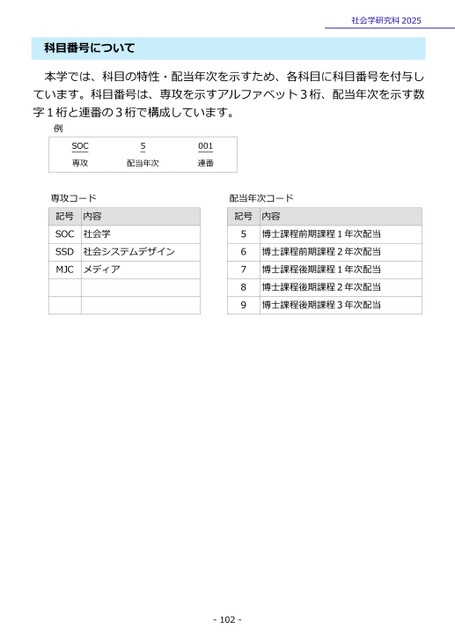 科目番号について社会学研究科2025本学では、科目の特性・配当年次を示すため、各科目に科目番号を付与しています。科目番号は、専攻を示すアルファベット3桁、配当年次を示す数字1桁と連番の3桁で構成しています。例SOC専攻5配当年次001連番専攻コード配当年次コード記号SOCSSDMJC内容社会学社会システムデザインメディア記号56789内容博士課程前期課程1年次配当博士課程前期課程2年次配当博士課程後期課程1年次配当博士課程後期課程2年次配当博士課程後期課程3年次配当-102-