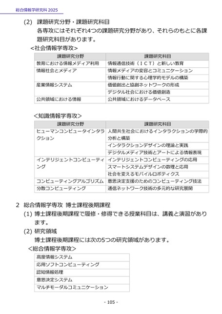 総合情報学研究科2025(2)課題研究分野・課題研究科目各専攻にはそれぞれ4つの課題研究分野があり、それらのもとに各課題研究科目があります。<社会情報学専攻>課題研究分野教育における情報メディア利用情報社会とメディア産業情報システム公共領域における情報<知識情報学専攻>課題研究分野ヒューマンコンピュータインタラクションインテリジェントコンピューティングコンピューティングアルゴリズム分散コンピューティング課題研究科目情報通信技術(ICT)と新しい教育情報メディアの変容とコミュニケーション情報行動に関する心理学的モデルの構築価値創出と協創ネットワークの形成デジタル社会における価値創造公共領域におけるデータベース課題研究科目人間共生社会におけるインタラクションの学際的分析と構築インタラクションデザインの理論と実践デジタルメディア技術とアートによる情報表現インテリジェントコンピューティングの応用スマートシステムデザインの数理と応用社会を変えるモバイルロボティクス意思決定支援のためのコンピューティング技法通信ネットワーク技術の多元的な研究展開2総合情報学専攻博士課程後期課程(1)博士課程後期課程で履修・修得できる授業科目は、講義と演習があります。(2)研究領域博士課程後期課程には次の5つの研究領域があります。<総合情報学専攻>高度情報システム応用ソフトコンピューティング認知情報処理意思決定システムマルチモーダルコミュニケーション-105-