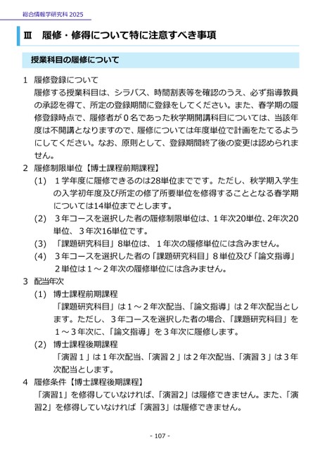 総合情報学研究科2025Ⅲ履修・修得について特に注意すべき事項授業科目の履修について1履修登録について履修する授業科目は、シラバス、時間割表等を確認のうえ、必ず指導教員の承認を得て、所定の登録期間に登録をしてください。また、春学期の履修登録時点で、履修者が0名であった秋学期開講科目については、当該年度は不開講となりますので、履修については年度単位で計画をたてるようにしてください。なお、原則として、登録期間終了後の変更は認められません。2履修制限単位【博士課程前期課程】(1)(2)(3)(4)1学年度に履修できるのは28単位までです。ただし、秋学期入学生の入学初年度及び所定の修了所要単位を修得することとなる春学期については14単位までとします。3年コースを選択した者の履修制限単位は、1年次20単位、2年次20単位、3年次16単位です。「課題研究科目」8単位は、1年次の履修単位には含みません。3年コースを選択した者の「課題研究科目」8単位及び「論文指導」2単位は1~2年次の履修単位には含みません。3配当年次(1)博士課程前期課程「課題研究科目」は1~2年次配当、「論文指導」は2年次配当とします。ただし、3年コースを選択した者の場合、「課題研究科目」を1~3年次に、「論文指導」を3年次に履修します。博士課程後期課程「演習1」は1年次配当、「演習2」は2年次配当、「演習3」は3年次配当とします。(2)4履修条件【博士課程後期課程】「演習1」を修得していなければ、「演習2」は履修できません。また、「演習2」を修得していなければ「演習3」は履修できません。-107-