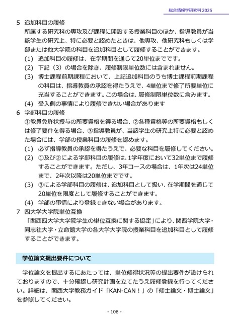 5追加科目の履修総合情報学研究科2025所属する研究科の専攻及び課程に開設する授業科目のほか、指導教員が当該学生の研究上、特に必要と認めたときは、他専攻、他研究科もしくは学部または他大学院の科目を追加科目として履修することができます。(1)(2)(3)追加科目の履修は、在学期間を通じて20単位までです。下記(3)の場合を除き、履修制限単位数には含まれません。博士課程前期課程において、上記追加科目のうち博士課程前期課程の科目は、指導教員の承認を得たうえで、4単位まで修了所要単位に充当することができます。この場合は、履修制限単位数に含みます。受入側の事情により履修できない場合があります(4)6学部科目の履修①教員免許状授与の所要資格を得る場合、②各種資格等の所要資格もしくは修了要件を得る場合、③指導教員が、当該学生の研究上特に必要と認めた場合には、学部の授業科目の履修を認めます。(1)(2)必ず指導教員の承認を得たうえで、必要な科目を履修してください。①及び②による学部科目の履修は、1学年度において32単位まで履修することができます。ただし、3年コースの場合は、1年次は24単位まで、2年次以降は20単位までです。③による学部科目の履修は、追加科目として扱い、在学期間を通じて20単位を限度として履修することができます。学部の事情により登録できない場合があります。(3)(4)7四大学大学院単位互換「関西四大学大学院学生の単位互換に関する協定」により、関西学院大学・同志社大学・立命館大学の各大学大学院の授業科目を追加科目として履修することができます。位論文提出要件について学学位論文を提出するにあたっては、単位修得状況等の提出要件が設けられておりますので、十分確認し研究計画を立てたうえ履修登録を行ってください。詳細は、関西大学教務ガイド「KAN-CAN!」の「修士論文・博士論文」を参照してください。-108-