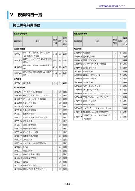 Ⅴ授業科目一覧博士課程前期課程社会情報学専攻社会情報学専攻総合情報学研究科2025履修上の区分選択選択選択選択選択選択選択選択選択選択選択選択選択選択選択選択選択選択科目番号科目配当年次単位共通科目INF5027現代哲学INF5028認知科学特論INF5029情報メディア論INF5030デジタルアーカイブ構築論INF5031芸術メディア論INF5032企業評価論INF5033政治データベース論INF5034行政データ分析INF5035ゲーム理論INF5036リモートセンシングINF5037ユーザ中心デザインINF5038ネットワークコンピューティングINF5039モバイルコンピューティングINF5040実践IT企業論INF5041協調的交渉論INF5042ICTforLearningINF5043INF5044特別講義(社会空間情報科学)アドバンストインターンシップ(各機関)111111111111111111222222222222222222科目番号科目配当年次単位課題研究分野教育における情報メディア利用(各課題研究科目)情報社会とメディア(各課題研究科目)産業情報システム(各課題研究科目)公共領域における情報(各課題研究科目)1~21~21~21~28888INF5001INF5002INF5003INF5004論文指導履修上の区分必修必修必修必修INF6001論文指導専門領域科目INF5005マルチメディア教育論INF5006多文化共生とコミュニケーションINF5007フィールドリサーチ方法論INF5008メディア文化論INF5009社会階層論INF5010社会心理学特論INF5011社会的影響論INF5012社会的アイデンティティー論INF5013経営情報論INF5014国際経営戦略論INF5015組織情報管理論INF5016マーケティング論INF5017消費者意思決定論INF5018企業会計論INF5019社会科学における因果推論INF5020金融論INF5021環境経済学INF5022経済学と個人の選好INF5023知的財産法特論INF5024情報法INF5025組織調査研究法INF5026質的研究(エスノグラフィー)211111111111111111111112必修2222222222222222222222選択選択選択選択選択選択選択選択選択選択選択選択選択選択選択選択選択選択選択選択選択選択-112-