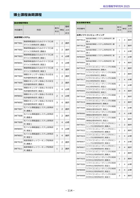 博士課程後期課程総合情報学専攻科目番号科目高度情報システム配当年次単位INF7001INF7002INF7003INF8001INF9001INF7004INF7005INF7006INF8002INF9002INF7007INF7008INF7009INF8003INF9003INF7010INF7011無線情報通信のためのマイクロ波デバイス特殊研究講義A無線情報通信のためのマイクロ波デバイス特殊研究講義B無線情報通信のためのマイクロ波デバイス特殊研究演習1無線情報通信のためのマイクロ波デバイス特殊研究演習2無線情報通信のためのマイクロ波デバイス特殊研究演習3情報セキュリティ技術とその安全性評価特殊研究講義A情報セキュリティ技術とその安全性評価特殊研究講義B情報セキュリティ技術とその安全性評価特殊研究演習1情報セキュリティ技術とその安全性評価特殊研究演習2情報セキュリティ技術とその安全性評価特殊研究演習3モバイル情報通信システム特殊研究講義Aモバイル情報通信システム特殊研究講義Bモバイル情報通信システム特殊研究演習1モバイル情報通信システム特殊研究演習2モバイル情報通信システム特殊研究演習3高度情報ネットワーキング特殊研究講義A高度情報ネットワーキング特殊研究講義B1112311123111231122444224442244422履修上の区分選択選択必修必修選択選択選択必修必修選択選択選択必修必修選択選択選択総合情報学研究科2025総合情報学専攻科目番号科目応用ソフトコンピューティングINF7012INF7013INF7014INF8004INF9004INF7015INF7016INF7017INF8005INF9005INF7018INF7019INF7020INF8006INF9006INF7021INF7022INF7023INF8007INF9007INF7024INF7025INF7026INF8008INF9008脳知能情報システム特殊研究講義A脳知能情報システム特殊研究講義B脳知能情報システム特殊研究演習1脳知能情報システム特殊研究演習2脳知能情報システム特殊研究演習3ソフトコンピューティングの実践的応用特殊研究講義Aソフトコンピューティングの実践的応用特殊研究講義Bソフトコンピューティングの実践的応用特殊研究演習1ソフトコンピューティングの実践的応用特殊研究演習2ソフトコンピューティングの実践的応用特殊研究演習3ソフトコンピューティングの視覚情報処理特殊研究講義Aソフトコンピューティングの視覚情報処理特殊研究講義Bソフトコンピューティングの視覚情報処理特殊研究演習1ソフトコンピューティングの視覚情報処理特殊研究演習2ソフトコンピューティングの視覚情報処理特殊研究演習3ソフトコンピューティングのセンシング応用特殊研究講義Aソフトコンピューティングのセンシング応用特殊研究講義Bソフトコンピューティングのセンシング応用特殊研究演習1ソフトコンピューティングのセンシング応用特殊研究演習2ソフトコンピューティングのセンシング応用特殊研究演習3ソフトコンピューティングの地球科学的応用特殊研究講義Aソフトコンピューティングの地球科学的応用特殊研究講義Bソフトコンピューティングの地球科学的応用特殊研究演習1ソフトコンピューティングの地球科学的応用特殊研究演習2ソフトコンピューティングの地球科学的応用特殊研究演習3配当年次単位11123111231112311123111232244422444224442244422444履修上の区分選択選択必修必修選択選択選択必修必修選択選択選択必修必修選択選択選択必修必修選択選択選択必修必修選択-114-