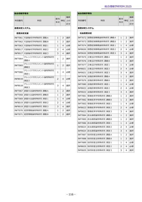 総合情報学専攻科目番号科目意思決定システム意思決定支援配当年次単位履修上の区分総合情報学研究科2025総合情報学専攻科目番号科目意思決定システム社会意思決定INF7072国際経営戦略論特殊研究講義AINF7073国際経営戦略論特殊研究講義BINF7074国際経営戦略論特殊研究演習1INF8020国際経営戦略論特殊研究演習2INF9020国際経営戦略論特殊研究演習3INF7075企業会計特殊研究講義AINF7076企業会計特殊研究講義BINF7077企業会計特殊研究演習1INF8021企業会計特殊研究演習2INF9021企業会計特殊研究演習3INF7078金融政策特殊研究講義AINF7079金融政策特殊研究講義BINF7080金融政策特殊研究演習1INF8022金融政策特殊研究演習2INF9022金融政策特殊研究演習3INF7081環境経済学特殊研究講義AINF7082環境経済学特殊研究講義BINF7083環境経済学特殊研究演習1INF8023環境経済学特殊研究演習2INF9023環境経済学特殊研究演習3INF7084政治過程論特殊研究講義AINF7085政治過程論特殊研究講義BINF7086政治過程論特殊研究演習1INF8024政治過程論特殊研究演習2INF9024政治過程論特殊研究演習3INF7087知的財産法特殊研究講義AINF7088知的財産法特殊研究講義BINF7089知的財産法特殊研究演習1INF8025知的財産法特殊研究演習2INF9025知的財産法特殊研究演習3配当年次単位履修上の区分111231112311123111231112311123224442244422444224442244422444選択選択必修必修選択選択選択必修必修選択選択選択必修必修選択選択選択必修必修選択選択選択必修必修選択選択選択必修必修選択22444224442244422選択選択必修必修選択選択選択必修必修選択選択選択必修必修選択選択選択-116-INF7061代数幾何学特殊研究講義AINF7062代数幾何学特殊研究講義BINF7063代数幾何学特殊研究演習1INF8017代数幾何学特殊研究演習2INF9017INF7064INF7065INF7066INF8018INF9018INF7067代数幾何学特殊研究演習3ナレッジマネジメント論特殊研究講義Aナレッジマネジメント論特殊研究講義Bナレッジマネジメント論特殊研究演習1ナレッジマネジメント論特殊研究演習2ナレッジマネジメント論特殊研究演習3調査方法論特殊研究講義AINF7068調査方法論特殊研究講義BINF7069調査方法論特殊研究演習1INF8019調査方法論特殊研究演習2INF9019調査方法論特殊研究演習3INF7070経営情報論特殊研究講義AINF7071経営情報論特殊研究講義B11123111231112311