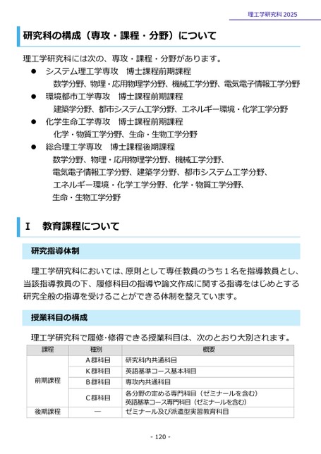 研究科の構成(専攻・課程・分野)について理工学研究科には次の、専攻・課程・分野があります。システム理工学専攻博士課程前期課程理工学研究科2025数学分野、物理・応用物理学分野、機械工学分野、電気電子情報工学分野環境都市工学専攻博士課程前期課程建築学分野、都市システム工学分野、エネルギー環境・化学工学分野化学生命工学専攻博士課程前期課程化学・物質工学分野、生命・生物工学分野総合理工学専攻博士課程後期課程数学分野、物理・応用物理学分野、機械工学分野、電気電子情報工学分野、建築学分野、都市システム工学分野、エネルギー環境・化学工学分野、化学・物質工学分野、生命・生物工学分野教育課程についてⅠ研究指導体制理工学研究科においては、原則として専任教員のうち1名を指導教員とし、当該指導教員の下、履修科目の指導や論文作成に関する指導をはじめとする研究全般の指導を受けることができる体制を整えています。授業科目の構成理工学研究科で履修・修得できる授業科目は、次のとおり大別されます。課程前期課程後期課程種別A群科目K群科目B群科目C群科目―概要研究科内共通科目英語基準コース基本科目専攻内共通科目各分野の定める専門科目(ゼミナールを含む)英語基準コース専門科目(ゼミナールを含む)ゼミナール及び派遣型実習教育科目-120-