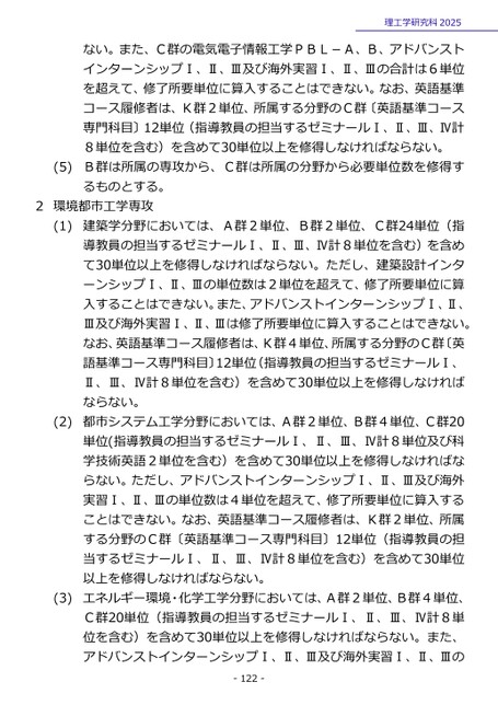 理工学研究科2025ない。また、C群の電気電子情報工学PBL-A、B、アドバンストインターンシップⅠ、Ⅱ、Ⅲ及び海外実習Ⅰ、Ⅱ、Ⅲの合計は6単位を超えて、修了所要単位に算入することはできない。なお、英語基準コース履修者は、K群2単位、所属する分野のC群〔英語基準コース専門科目〕12単位(指導教員の担当するゼミナールⅠ、Ⅱ、Ⅲ、Ⅳ計8単位を含む)を含めて30単位以上を修得しなければならない。B群は所属の専攻から、C群は所属の分野から必要単位数を修得するものとする。(5)2環境都市工学専攻(1)(2)(3)建築学分野においては、A群2単位、B群2単位、C群24単位(指導教員の担当するゼミナールⅠ、Ⅱ、Ⅲ、Ⅳ計8単位を含む)を含めて30単位以上を修得しなければならない。ただし、建築設計インターンシップⅠ、Ⅱ、Ⅲの単位数は2単位を超えて、修了所要単位に算入することはできない。また、アドバンストインターンシップⅠ、Ⅱ、Ⅲ及び海外実習Ⅰ、Ⅱ、Ⅲは修了所要単位に算入することはできない。なお、英語基準コース履修者は、K群4単位、所属する分野のC群〔英語基準コース専門科目〕12単位(指導教員の担当するゼミナールⅠ、Ⅱ、Ⅲ、Ⅳ計8単位を含む)を含めて30単位以上を修得しなければならない。都市システム工学分野においては、A群2単位、B群4単位、C群20単位(指導教員の担当するゼミナールⅠ、Ⅱ、Ⅲ、Ⅳ計8単位及び科学技術英語2単位を含む)を含めて30単位以上を修得しなければならない。ただし、アドバンストインターンシップⅠ、Ⅱ、Ⅲ及び海外実習Ⅰ、Ⅱ、Ⅲの単位数は4単位を超えて、修了所要単位に算入することはできない。なお、英語基準コース履修者は、K群2単位、所属する分野のC群〔英語基準コース専門科目〕12単位(指導教員の担当するゼミナールⅠ、Ⅱ、Ⅲ、Ⅳ計8単位を含む)を含めて30単位以上を修得しなければならない。エネルギー環境・化学工学分野においては、A群2単位、B群4単位、C群20単位(指導教員の担当するゼミナールⅠ、Ⅱ、Ⅲ、Ⅳ計8単位を含む)を含めて30単位以上を修得しなければならない。また、アドバンストインターンシップⅠ、Ⅱ、Ⅲ及び海外実習Ⅰ、Ⅱ、Ⅲの-122-