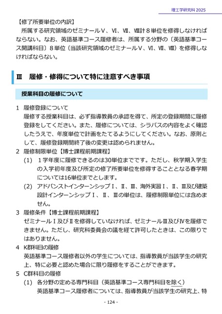 【修了所要単位の内訳】理工学研究科2025所属する研究領域のゼミナールⅤ、Ⅵ、Ⅶ、Ⅷ計8単位を修得しなければならない。なお、英語基準コース履修者は、所属する分野の〔英語基準コース開講科目〕8単位(当該研究領域のゼミナールⅤ、Ⅵ、Ⅶ、Ⅷ)を修得しなければならない。履修・修得について特に注意すべき事項Ⅲ授業科目の履修について1履修登録について履修する授業科目は、必ず指導教員の承認を得て、所定の登録期間に履修登録をしてください。また、履修については、シラバスの内容をよく確認したうえで、年度単位で計画をたてるようにしてください。なお、原則として、履修登録期間終了後の変更は認められません。2履修制限単位【博士課程前期課程】(1)(2)1学年度に履修できるのは30単位までです。ただし、秋学期入学生の入学初年度及び所定の修了所要単位を修得することとなる春学期については16単位までとします。アドバンストインターンシップⅠ、Ⅱ、Ⅲ、海外実習Ⅰ、Ⅱ、Ⅲ及び建築設計インターンシップⅠ、Ⅱ、Ⅲの単位は、履修制限単位には含めません。3履修条件【博士課程前期課程】ゼミナールⅠ及びⅡを修得していなければ、ゼミナールⅢ及びⅣを履修できません。ただし、研究科委員会の議を経て許可したときは、この限りではありません。K群科目の履修英語基準コース履修者以外の学生については、指導教員が当該学生の研究上、特に必要と認めた場合に限り履修をすることができます。C群科目の履修(1)各分野の定める専門科目(英語基準コース専門科目を除く)英語基準コース履修者については、指導教員が当該学生の研究上、特-124-45