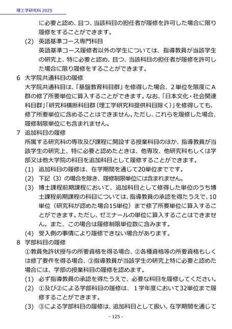 理工学研究科2025(2)に必要と認め、且つ、当該科目の担任者が履修を許可した場合に限り履修をすることができます。英語基準コース専門科目英語基準コース履修者以外の学生については、指導教員が当該学生の研究上、特に必要と認め、且つ、当該科目の担任者が履修を許可した場合に限り履修をすることができます。6大学院共通科目の履修大学院共通科目は、「基盤教育科目群」を修得した場合、2単位を限度にA群の修了所要単位に算入することができます。なお、「日本文化・社会関連科目群」「研究科横断科目群(理工学研究科提供科目除く)」を修得しても、修了所要単位に含めることはできません。ただし、これらを履修した場合、履修制限単位にも含まれません。7追加科目の履修所属する研究科の専攻及び課程に開設する授業科目のほか、指導教員が当該学生の研究上、特に必要と認めたときは、他専攻、他研究科もしくは学部又は他大学院の科目を追加科目として履修することができます。(1)(2)(3)追加科目の履修は、在学期間を通じて20単位までです。下記(3)の場合を除き、履修制限単位には含まれません。博士課程前期課程において、追加科目として修得した単位のうち博士課程前期課程の科目については、指導教員の承認を得たうえで、10単位(研究科が認めた場合15単位)まで修了所要単位に算入することができます。ただし、ゼミナールの単位に算入することはできません。また、この場合は履修制限単位数に含みます。受入側の事情により履修できない場合があります。(4)8学部科目の履修①教員免許状授与の所要資格を得る場合、②各種資格等の所要資格もしくは修了要件を得る場合、③指導教員が当該学生の研究上特に必要と認めた場合には、学部の授業科目の履修を認めます。(1)(2)必ず指導教員の承認を得たうえで、必要な科目を履修してください。①及び②による学部科目の履修は、1学年度において32単位まで履修することができます。③による学部科目の履修は、追加科目として扱い、在学期間を通じて(3)-125-
