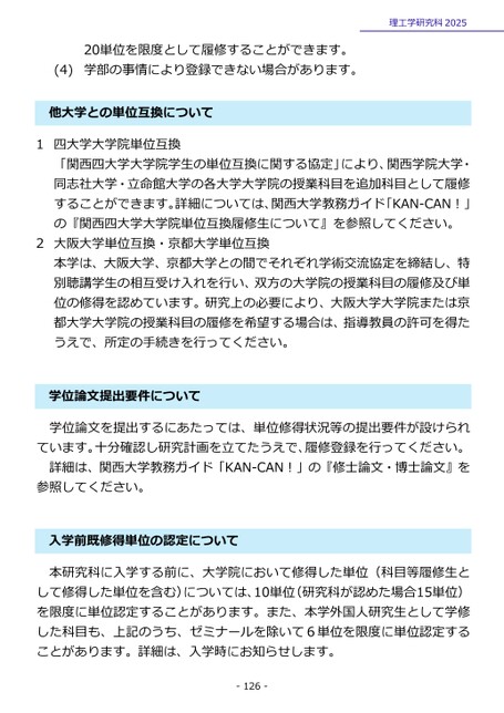 理工学研究科202520単位を限度として履修することができます。学部の事情により登録できない場合があります。(4)他大学との単位互換について1四大学大学院単位互換「関西四大学大学院学生の単位互換に関する協定」により、関西学院大学・同志社大学・立命館大学の各大学大学院の授業科目を追加科目として履修することができます。詳細については、関西大学教務ガイド「KAN-CAN!」の『関西四大学大学院単位互換履修生について』を参照してください。2大阪大学単位互換・京都大学単位互換本学は、大阪大学、京都大学との間でそれぞれ学術交流協定を締結し、特別聴講学生の相互受け入れを行い、双方の大学院の授業科目の履修及び単位の修得を認めています。研究上の必要により、大阪大学大学院または京都大学大学院の授業科目の履修を希望する場合は、指導教員の許可を得たうえで、所定の手続きを行ってください。学位論文提出要件について学位論文を提出するにあたっては、単位修得状況等の提出要件が設けられています。十分確認し研究計画を立てたうえで、履修登録を行ってください。詳細は、関西大学教務ガイド「KAN-CAN!」の『修士論文・博士論文』を参照してください。入学前既修得単位の認定について本研究科に入学する前に、大学院において修得した単位(科目等履修生として修得した単位を含む)については、10単位(研究科が認めた場合15単位)を限度に単位認定することがあります。また、本学外国人研究生として学修した科目も、上記のうち、ゼミナールを除いて6単位を限度に単位認定することがあります。詳細は、入学時にお知らせします。-126-