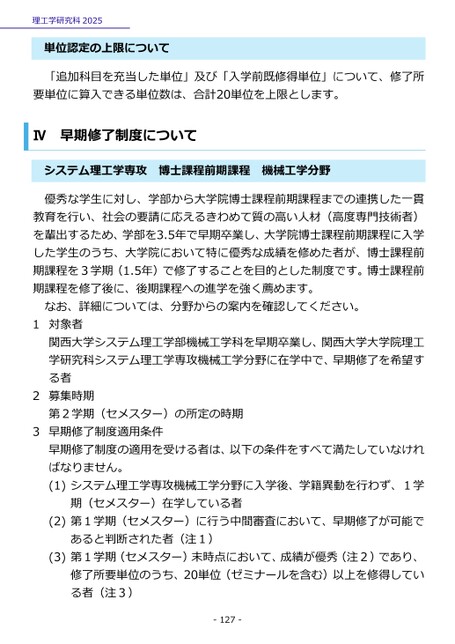「追加科目を充当した単位」及び「入学前既修得単位」について、修了所要単位に算入できる単位数は、合計20単位を上限とします。早期修了制度についてⅣシステム理工学専攻博士課程前期課程機械工学分野優秀な学生に対し、学部から大学院博士課程前期課程までの連携した一貫教育を行い、社会の要請に応えるきわめて質の高い人材(高度専門技術者)を輩出するため、学部を3.5年で早期卒業し、大学院博士課程前期課程に入学した学生のうち、大学院において特に優秀な成績を修めた者が、博士課程前期課程を3学期(1.5年)で修了することを目的とした制度です。博士課程前期課程を修了後に、後期課程への進学を強く薦めます。なお、詳細については、分野からの案内を確認してください。1対象者関西大学システム理工学部機械工学科を早期卒業し、関西大学大学院理工学研究科システム理工学専攻機械工学分野に在学中で、早期修了を希望する者2募集時期第2学期(セメスター)の所定の時期3早期修了制度適用条件早期修了制度の適用を受ける者は、以下の条件をすべて満たしていなければなりません。(1)システム理工学専攻機械工学分野に入学後、学籍異動を行わず、1学期(セメスター)在学している者(2)第1学期(セメスター)に行う中間審査において、早期修了が可能であると判断された者(注1)(3)第1学期(セメスター)末時点において、成績が優秀(注2)であり、修了所要単位のうち、20単位(ゼミナールを含む)以上を修得している者(注3)-127-理工学研究科2025単位認定の上限について