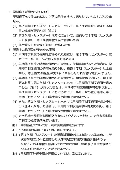 4早期修了が認められる条件理工学研究科2025早期修了をするためには、以下の条件をすべて満たしていなければなりません。(1)第2学期(セメスター)末時点において、修了所要単位に含まれる科目の成績が優秀な者(注2)(2)第3学期(セメスター)末時点において、連続して3学期(セメスター)在学し、修了所要単位を全て修得した者(3)修士論文の審査及び試験に合格した者5履修上の措置及びその他の事項(1)早期修了制度の適用を認められた者には、第3学期(セメスター)にゼミナールⅢ、Ⅳの並行履修を認めます。(2)早期修了制度の適用を認められた者に、学籍異動があった場合は、早期修了制度適用の許可を取り消し、通算4学期(セメスター)以上在学し、修士論文の審査及び試験に合格しなければ修了を認めません。(3)早期修了制度の適用を認められた者から、指導教員を通じて、理工学研究科長に第2学期(セメスター)末までに早期修了制度適用辞退の申し出(注4)があった場合は、早期修了制度適用許可を取り消し、第3学期(セメスター)におけるゼミナールⅢ、Ⅳの並行履修と第3学期(セメスター)の修士論文の提出を認めません。(4)また、第3学期(セメスター)末までに早期修了制度適用辞退の申し出(注4)があった場合は、早期修了制度適用許可を取り消し、第3学期(セメスター)の修士論文の提出を認めません。(5)大学院博士課程前期課程入学時にガイダンスを実施し、大学院早期修了制度の概要説明を行います。注1:中間審査については、別に実施要領を定めます。注2:成績判定基準については、別に定めます。注3:第1学期(セメスター)の履修制限単位は16単位であるため、4年次春学期に10単位履修した大学院理工学研究科授業科目のうち、少なくとも4単位を修得しておかなければ、早期修了適用対象者となる条件を満たすことができません。注4:早期修了辞退申請の詳細については、別に定めます。-128-