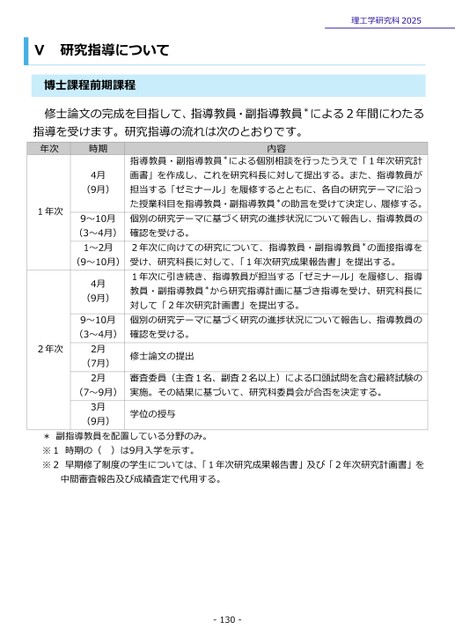 Ⅴ研究指導について博士課程前期課程理工学研究科2025修士論文の完成を目指して、指導教員・副指導教員*による2年間にわたる指導を受けます。研究指導の流れは次のとおりです。年次時期1年次2年次4月(9月)9~10月(3~4月)1~2月(9~10月)4月(9月)9~10月(3~4月)2月(7月)2月(7~9月)3月(9月)内容指導教員・副指導教員*による個別相談を行ったうえで「1年次研究計画書」を作成し、これを研究科長に対して提出する。また、指導教員が担当する「ゼミナール」を履修するとともに、各自の研究テーマに沿った授業科目を指導教員・副指導教員*の助言を受けて決定し、履修する。個別の研究テーマに基づく研究の進捗状況について報告し、指導教員の確認を受ける。2年次に向けての研究について、指導教員・副指導教員*の面接指導を受け、研究科長に対して、「1年次研究成果報告書」を提出する。1年次に引き続き、指導教員が担当する「ゼミナール」を履修し、指導教員・副指導教員*から研究指導計画に基づき指導を受け、研究科長に対して「2年次研究計画書」を提出する。個別の研究テーマに基づく研究の進捗状況について報告し、指導教員の確認を受ける。修士論文の提出審査委員(主査1名、副査2名以上)による口頭試問を含む最終試験の実施。その結果に基づいて、研究科委員会が合否を決定する。学位の授与*副指導教員を配置している分野のみ。※1時期の(※2早期修了制度の学生については、「1年次研究成果報告書」及び「2年次研究計画書」を)は9月入学を示す。中間審査報告及び成績査定で代用する。-130-