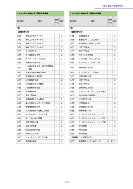 理工学研究科2025システム理工学専攻博士課程前期課程システム理工学専攻博士課程前期課程科目番号科目配当年次単位科目番号科目配当年次単位C群機械工学分野C群機械工学分野222222222222222222222222222ENS5ENS5ENS6ENS6ENS5ENS5ENS5ENS5ENS5ENS5ENS5ENS5ENS5ENS5ENS5ENS5ENS5ENS5ENS5ENS5ENS5ENS5ENS5ENS5ENS5ENS5ENS5ENS5機械工学ゼミナールⅠ機械工学ゼミナールⅡ機械工学ゼミナールⅢ機械工学ゼミナールⅣナノ物理工学ナノ機能素子工学ナノバイオデバイス特論生体流体力学特論バイオメカニクス・流体工学特論(上級)マイクロ物質移動学特論流体弾性体力学応用材料評価学特論材料設計プロセス特論計算材料力学特論数学解析特論真空工学特論知能機械システム特論エンジニアリングトライボロジー情報機器制御工学ナノ表面制御・分析工学概論熱エネルギーシステム特論動力エネルギー特論気液二相流特論伝熱工学特論知能生産機械特論特殊加工学特論ナノ・マイクロ加工学特論応用数学特論11221111111111111111111111112222222222222222222222222222ENS5ENS5ENS5ENS5ENS5ENS5ENS5ENS5ENS5ENS5ENS5ENS5ENS5ENS5ENS5ENS5ENS5ENS5ENS5ENS5ENS5ENS5ENS5ENS5ENS5ENS5振動制御工学最適化アルゴリズム特論有限要素法と振動工学特論計測工学特論物性工学特論ロボット工学特論マイクロシステム工学特論ナノデバイスプロセス特論画像情報工学特論PIVシステム工学特論熱流体解析特論人間工学特論認知工学特論生体情報工学特論ヒューマンインターフェイス特論生物流体物理学特論材料強度学特論科学技術英語基礎物性科学特論固体物理学特論アドバンストインターンシップⅠアドバンストインターンシップⅡアドバンストインターンシップⅢ海外実習Ⅰ海外実習Ⅱ海外実習Ⅲ11111111111111111111111111〔英語基準コース専門科目〕ENS5英語基準コース(各テーマ)1・2-134-