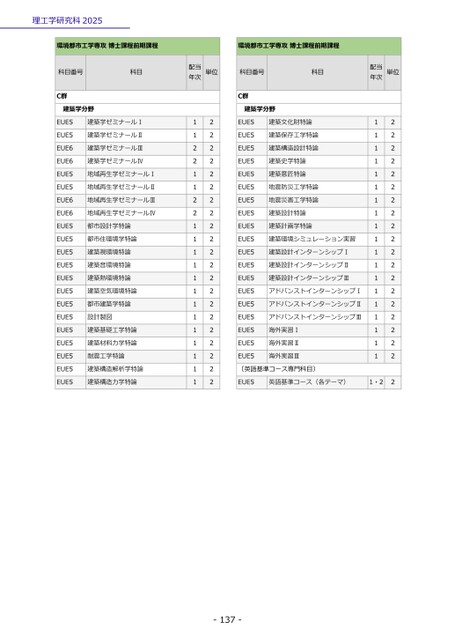 理工学研究科2025環境都市工学専攻博士課程前期課程環境都市工学専攻博士課程前期課程科目番号科目配当年次単位科目番号科目配当年次単位C群建築学分野C群建築学分野EUE5EUE5EUE5EUE5EUE5EUE5EUE5EUE5EUE5EUE5EUE5EUE5EUE5EUE5EUE5EUE5EUE5EUE5EUE5建築文化財特論建築保存工学特論建築構造設計特論建築史学特論建築意匠特論地震防災工学特論地震災害工学特論建築設計特論建築計画学特論建築環境シミュレーション実習建築設計インターンシップⅠ建築設計インターンシップⅡ建築設計インターンシップⅢアドバンストインターンシップⅠアドバンストインターンシップⅡアドバンストインターンシップⅢ海外実習Ⅰ海外実習Ⅱ海外実習Ⅲ1111111111111111111〔英語基準コース専門科目〕EUE5英語基準コース(各テーマ)1・222222222222222222222EUE5EUE5EUE6EUE6EUE5EUE5EUE6EUE6EUE5EUE5EUE5EUE5EUE5EUE5EUE5EUE5EUE5EUE5EUE5EUE5EUE5建築学ゼミナールⅠ建築学ゼミナールⅡ建築学ゼミナールⅢ建築学ゼミナールⅣ地域再生学ゼミナールⅠ地域再生学ゼミナールⅡ地域再生学ゼミナールⅢ地域再生学ゼミナールⅣ都市設計学特論都市住環境学特論建築視環境特論建築音環境特論建築熱環境特論建築空気環境特論都市建築学特論設計製図建築基礎工学特論建築材料力学特論耐震工学特論建築構造解析学特論建築構造力学特論112211221111111111111222222222222222222222-137-