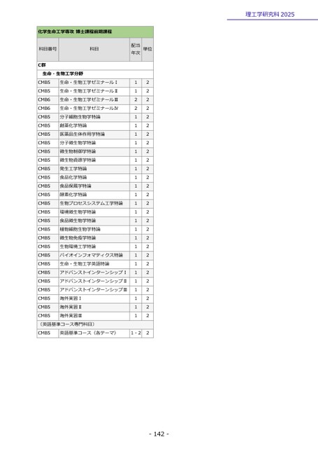 理工学研究科2025-142-化学生命工学専攻博士課程前期課程科目番号科目C群生命・生物工学分野配当年次単位CMB5CMB5CMB6CMB6CMB5CMB5CMB5CMB5CMB5CMB5CMB5CMB5CMB5CMB5CMB5CMB5CMB5CMB5CMB5CMB5CMB5CMB5CMB5CMB5CMB5CMB5CMB5CMB5生命・生物工学ゼミナールⅠ生命・生物工学ゼミナールⅡ生命・生物工学ゼミナールⅢ生命・生物工学ゼミナールⅣ分子細胞生物学特論創薬化学特論医薬品生体作用学特論分子微生物学特論微生物制御学特論微生物資源学特論発生工学特論食品化学特論食品保蔵学特論酵素化学特論生物プロセスシステム工学特論環境微生物学特論食品微生物学特論植物細胞生物学特論微生物免疫学特論生物環境工学特論バイオインフォマティクス特論生命・生物工学英語特論アドバンストインターンシップⅠアドバンストインターンシップⅡアドバンストインターンシップⅢ海外実習Ⅰ海外実習Ⅱ海外実習Ⅲ1122111111111111111111111111〔英語基準コース専門科目〕CMB5英語基準コース(各テーマ)1・222222222222222222222222222222