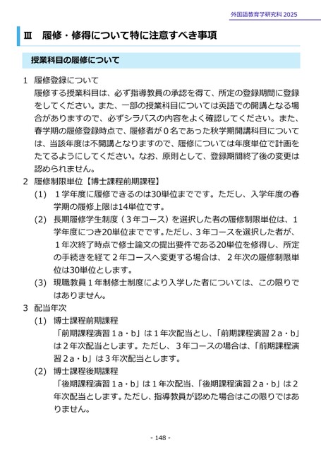 Ⅲ履修・修得について特に注意すべき事項外国語教育学研究科2025授業科目の履修について1履修登録について履修する授業科目は、必ず指導教員の承認を得て、所定の登録期間に登録をしてください。また、一部の授業科目については英語での開講となる場合がありますので、必ずシラバスの内容をよく確認してください。また、春学期の履修登録時点で、履修者が0名であった秋学期開講科目については、当該年度は不開講となりますので、履修については年度単位で計画をたてるようにしてください。なお、原則として、登録期間終了後の変更は認められません。2履修制限単位【博士課程前期課程】(1)(2)(3)1学年度に履修できるのは30単位までです。ただし、入学年度の春学期の履修上限は14単位です。長期履修学生制度(3年コース)を選択した者の履修制限単位は、1学年度につき20単位までです。ただし、3年コースを選択した者が、1年次終了時点で修士論文の提出要件である20単位を修得し、所定の手続きを経て2年コースへ変更する場合は、2年次の履修制限単位は30単位とします。現職教員1年制修士制度により入学した者については、この限りではありません。3配当年次(1)(2)博士課程前期課程「前期課程演習1a・b」は1年次配当とし、「前期課程演習2a・b」は2年次配当とします。ただし、3年コースの場合は、「前期課程演習2a・b」は3年次配当とします。博士課程後期課程「後期課程演習1a・b」は1年次配当、「後期課程演習2a・b」は2年次配当とします。ただし、指導教員が認めた場合はこの限りではありません。-148-