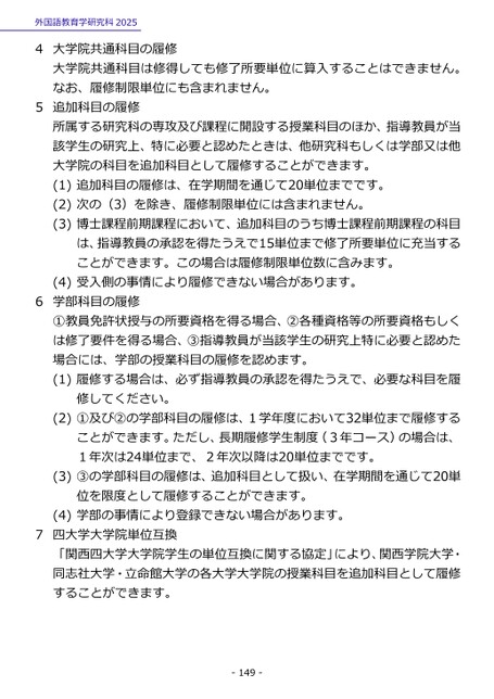 外国語教育学研究科20254大学院共通科目の履修大学院共通科目は修得しても修了所要単位に算入することはできません。なお、履修制限単位にも含まれません。5追加科目の履修所属する研究科の専攻及び課程に開設する授業科目のほか、指導教員が当該学生の研究上、特に必要と認めたときは、他研究科もしくは学部又は他大学院の科目を追加科目として履修することができます。(1)追加科目の履修は、在学期間を通じて20単位までです。(2)次の(3)を除き、履修制限単位には含まれません。(3)博士課程前期課程において、追加科目のうち博士課程前期課程の科目は、指導教員の承認を得たうえで15単位まで修了所要単位に充当することができます。この場合は履修制限単位数に含みます。(4)受入側の事情により履修できない場合があります。6学部科目の履修①教員免許状授与の所要資格を得る場合、②各種資格等の所要資格もしくは修了要件を得る場合、③指導教員が当該学生の研究上特に必要と認めた場合には、学部の授業科目の履修を認めます。(1)履修する場合は、必ず指導教員の承認を得たうえで、必要な科目を履修してください。(2)①及び②の学部科目の履修は、1学年度において32単位まで履修することができます。ただし、長期履修学生制度(3年コース)の場合は、1年次は24単位まで、2年次以降は20単位までです。(3)③の学部科目の履修は、追加科目として扱い、在学期間を通じて20単位を限度として履修することができます。(4)学部の事情により登録できない場合があります。7四大学大学院単位互換「関西四大学大学院学生の単位互換に関する協定」により、関西学院大学・同志社大学・立命館大学の各大学大学院の授業科目を追加科目として履修することができます。-149-