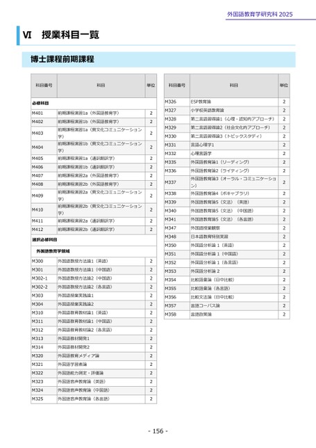 ESP教育論小学校英語教育論第二言語習得論1(心理・認知的アプローチ)第二言語習得論2(社会文化的アプローチ)第二言語習得論3(トピックスタディ)言語心理学1心理言語学外国語教育論1(リーディング)外国語教育論2(ライティング)外国語教育論3(オーラル・コミュニケーション)外国語教育論4(ボキャブラリ)外国語教育論5(文法)(英語)外国語教育論5(文法)(中国語)外国語教育論5(文法)(各言語)外国語授業観察日本語教育特別実習外国語分析論1(英語)外国語分析論1(中国語)外国語分析論1(各言語)外国語分析論2比較語彙論(日中比較)比較語彙論(各言語)比較文法論(日中比較)言語コーパス論言語政策論2222222222222222222222222M326M327M328M329M330M331M332M335M336M337M338M339M340M341M347M348M350M351M352M353M354M355M356M357M35822222222222222222222222222222Ⅵ授業科目一覧博士課程前期課程外国語教育学研究科2025科目単位科目番号科目単位科目番号必修科目M401M402M403M404M405M406M407M408M409M410M411M412前期課程演習1a(外国語教育学)前期課程演習1b(外国語教育学)前期課程演習1a(異文化コミュニケーション学)前期課程演習1b(異文化コミュニケーション学)前期課程演習1a(通訳翻訳学)前期課程演習1b(通訳翻訳学)前期課程演習2a(外国語教育学)前期課程演習2b(外国語教育学)前期課程演習2a(異文化コミュニケーション学)前期課程演習2b(異文化コミュニケーション学)前期課程演習2a(通訳翻訳学)前期課程演習2b(通訳翻訳学)選択必修科目外国語教育学領域M300M301M302-1M302-2外国語教授方法論1(英語)外国語教授方法論1(中国語)外国語教授方法論2(中国語)外国語教授方法論2(各言語)M303M304M310M311M312M313M314M320M321M322M323M324M325外国語授業実践論1外国語授業実践論2外国語教育教材論1(英語)外国語教育教材論1(中国語)外国語教育教材論2(各言語)外国語教材開発1外国語教材開発2外国語教育メディア論外国語学習者論外国語能力測定・評価論外国語音声教育論(英語)外国語音声教育論(中国語)外国語音声教育論(各言語)-156-